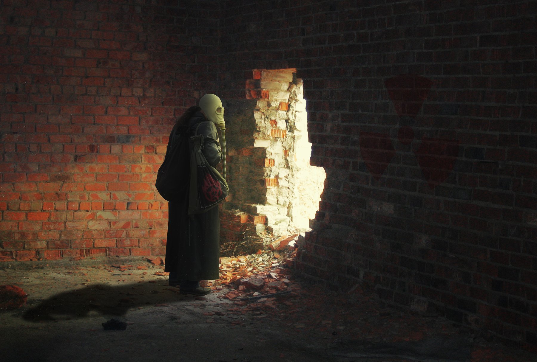 вирус, стена, луч света, мужчина в противогазе, Sergii Vidov