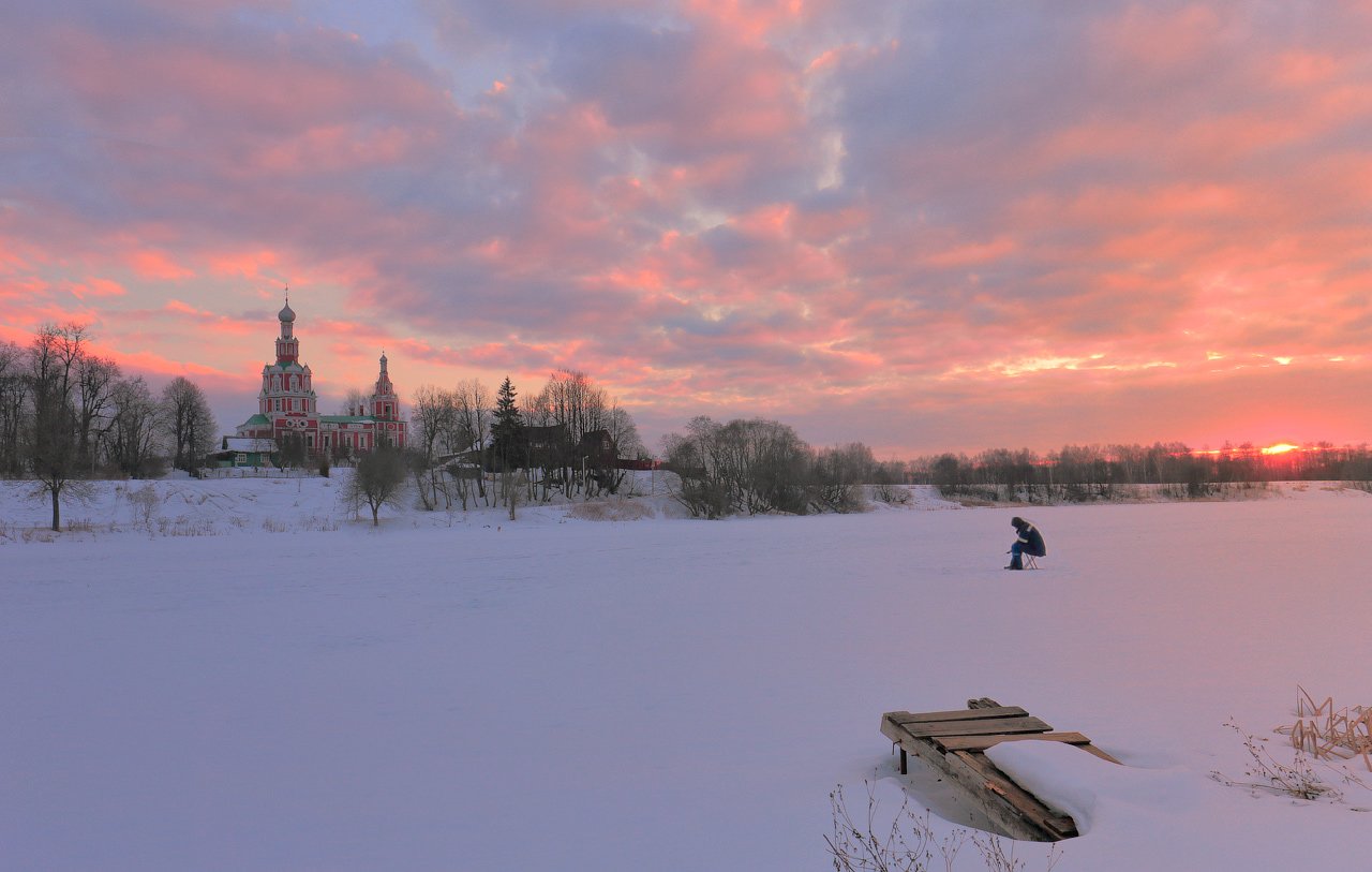 софрино, смоленская церковь, храм, вечер, закат, рыбак, зима, Виктор Климкин