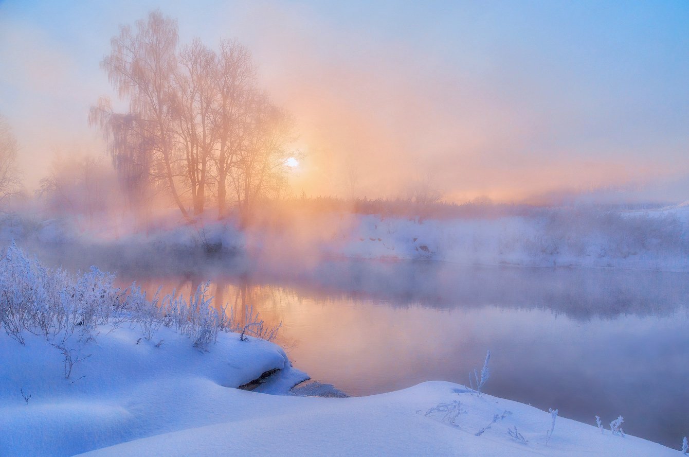 утро, зима, туман, солнце, рассвет, река, Виктор Климкин