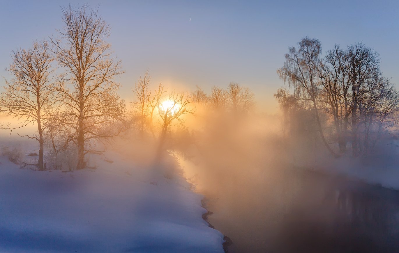 утро, зима, туман, солнце, рассвет, река, Виктор Климкин