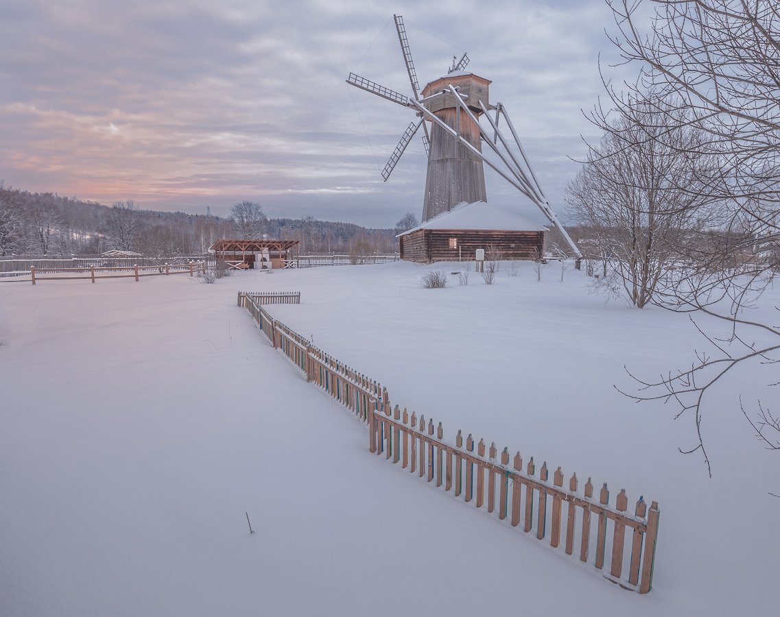 Нравится исполнение. Как вариант crop(275,1,1121,887) . Согласен, очень не хочется убирать красивый свет с отражением его на снегу, но забор как бы ставит ограничение. Взгляд по забору сразу направляется к мельнице. Было бы без забора, ничего резать не нужно... Мое ИМХО, ни на что не претендующее :)