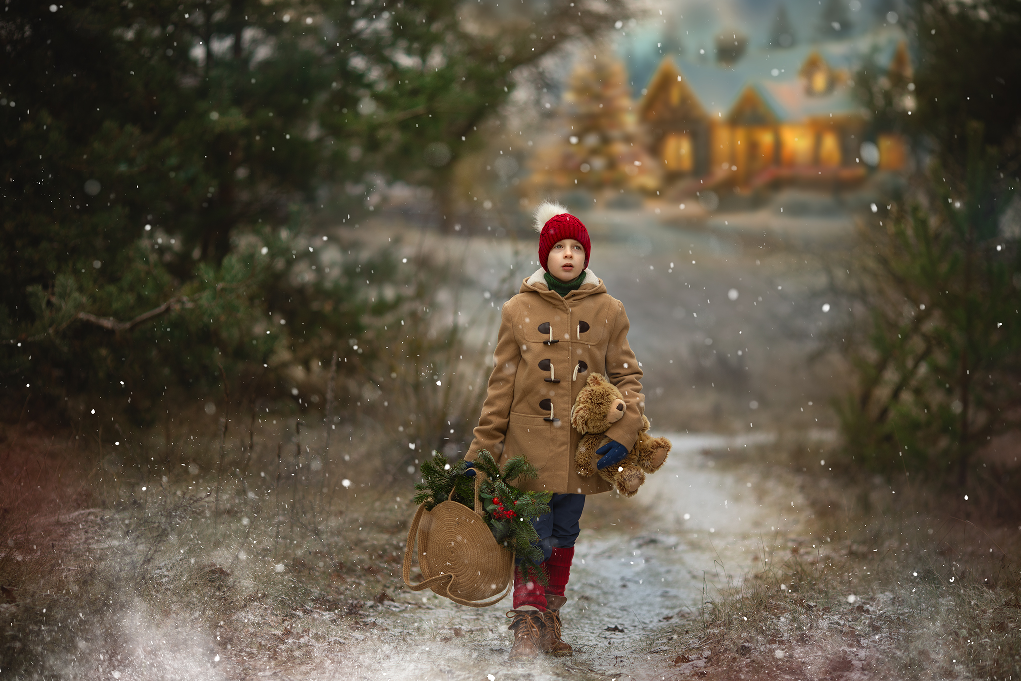 Child in coat, red hat, carries bear and basket with greenery.