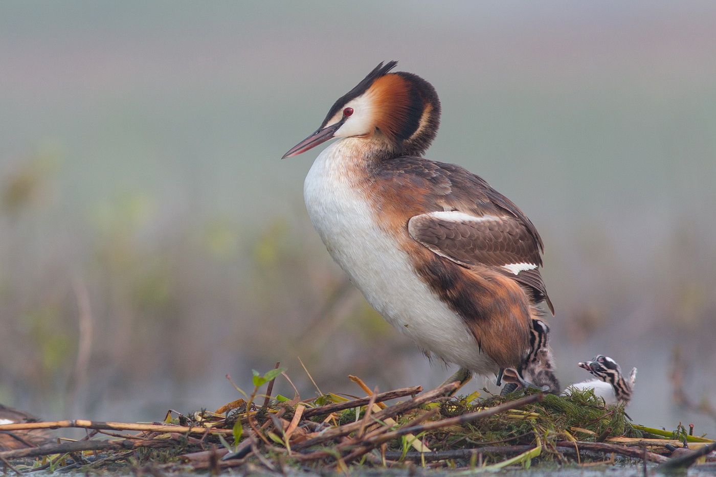 Пока чомга катает птенцов на себе,все выглядит очень заботливо и трогательно.Потом она возвращается в гнездо и,довольно бесцеремонно,вытряхивает их.Они падают как ни попадя,иногда вываливаясь из гнезда.