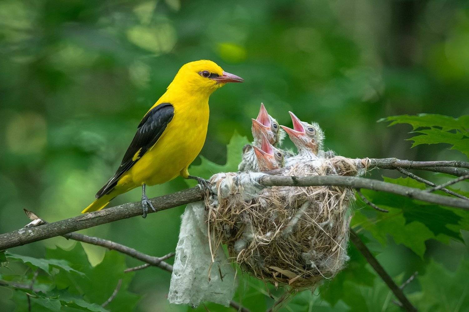 Вот и сбылась моя давняя мечта,поснимать иволгу на гнезде с птенцами.Надо сказать,иволгу вообще сложно снимать,из-за того,что она,практически,все свое время проводит в самом верхнем ярусе деревьев.И привязка к гнезду это,пожалуй,единственная реальная возможность провести с этой красивой птицей какое-то время в близком контакте.Но найти гнездо,пригодное для съемки оказалось очень сложно.Вообще,любое гнездо иволги сложно найти,оно где-то высоко,в кроне,и листья закрывают обзор,иволга же все время скачет с дерева на дерево и,находясь внизу,трудно понять,где же гнездо.А что б оно было не высоко,а рядом стояло какое-то большое дерево,на которое можно залезть,большая редкость.И вот на третий год поисков мне повезло.Я нашел-таки подходящее гнездо,на самом верху клена,на высоте 17 метров.А рядом отличная береза,на которую можно взобраться.А самое удивительное,что нашел я его в парке,в трехстах метрах от своего дома,прогуливаясь с собачкой.Наплевав на удивленных прохожих,десять дней,каждое утро я карабкался на эту березу.Честно говоря,мне было страшно,страшно,когда я лез,страшно сидеть там,а особенно страшно слезать,и я не знаю,что заставляет нас совершать такие странные поступки.Но теперь я с огромным удовольствием вспоминаю,иволгу,птенцов,раскачивающуюся на ветру березу,вылупившихся прохожих.Все-таки фотоохота это отличное приключение.