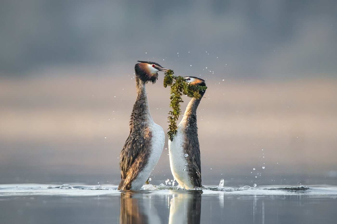 Два гребенчатых поганца, вынырнув из воды, держат в клювах зелёные водоросли и смотрят друг на друга, словно сравнивая высоту. Сцена захватывает момент естественного поведения птиц — возможно, это часть ритуала или игры. Отражение в воде усиливает симметрию кадра, а брызги придают динамику. Фотография передаёт живость и взаимодействие в природе без лишней драматизации.