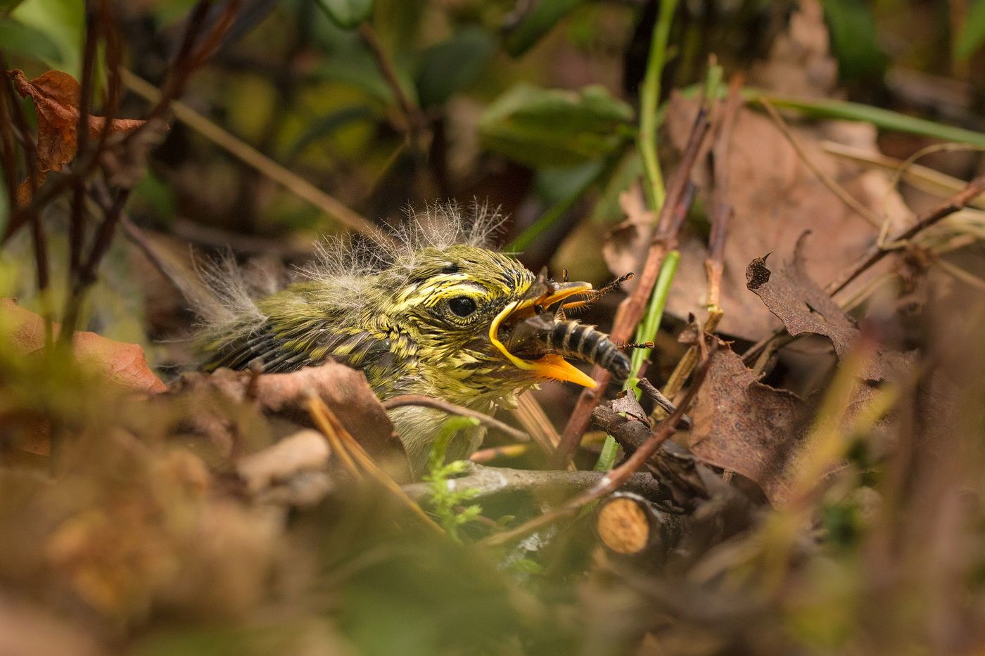 Пеночка,одна из самых маленьких птичек в наших широтах,а птенцы её размером сантиметра по три-четыре,настолько малы,что приходится брать макрообъектив для съемки и подползать на полметра.Пеночку это совершенно не смущает,а мне очень интересно с такого близкого расстояния наблюдать за кормлением