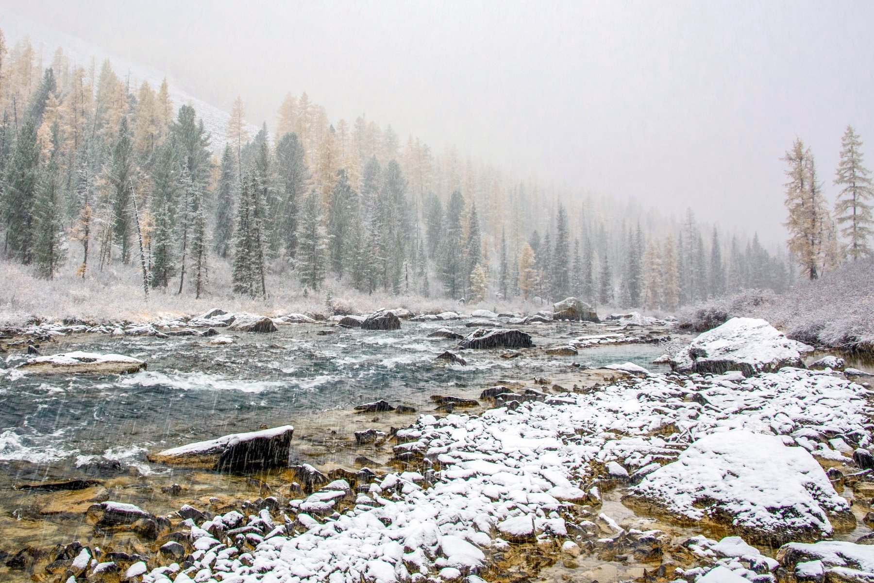 Внезапно наступившая в Алтайских горах зима, атаковала нас стремительно несущимися белыми трассирующими зарядами из всех своих снеговых туч.
