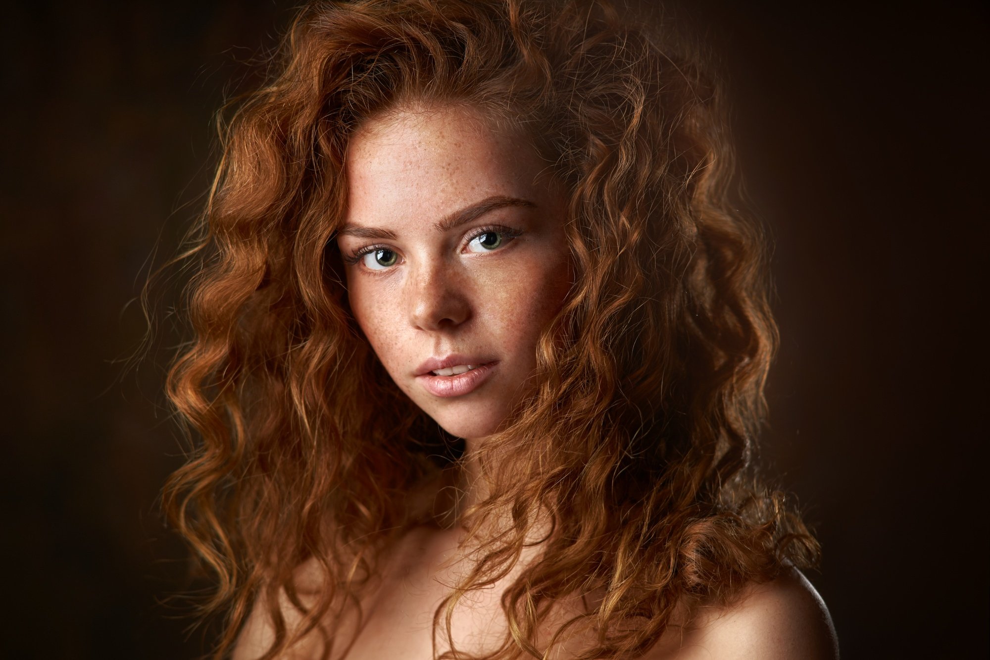 В этом портрете — тонкая игра света и тени, подчёркивающая текстуру вьющихся волос и выразительность глаз. Модель смотрит прямо в камеру, будто вступая в тихий диалог с зрителем. Студийное освещение создаёт атмосферу уединённой интимности, где каждая деталь лица — от бровей до шеи — наполнена смыслом. Фотография передаёт не только внешность, но и внутреннюю энергию, скрытую за спокойным выражением. Работа Александра Виноградова — это искусство улавливать момент, когда красота становится почти осязаемой.