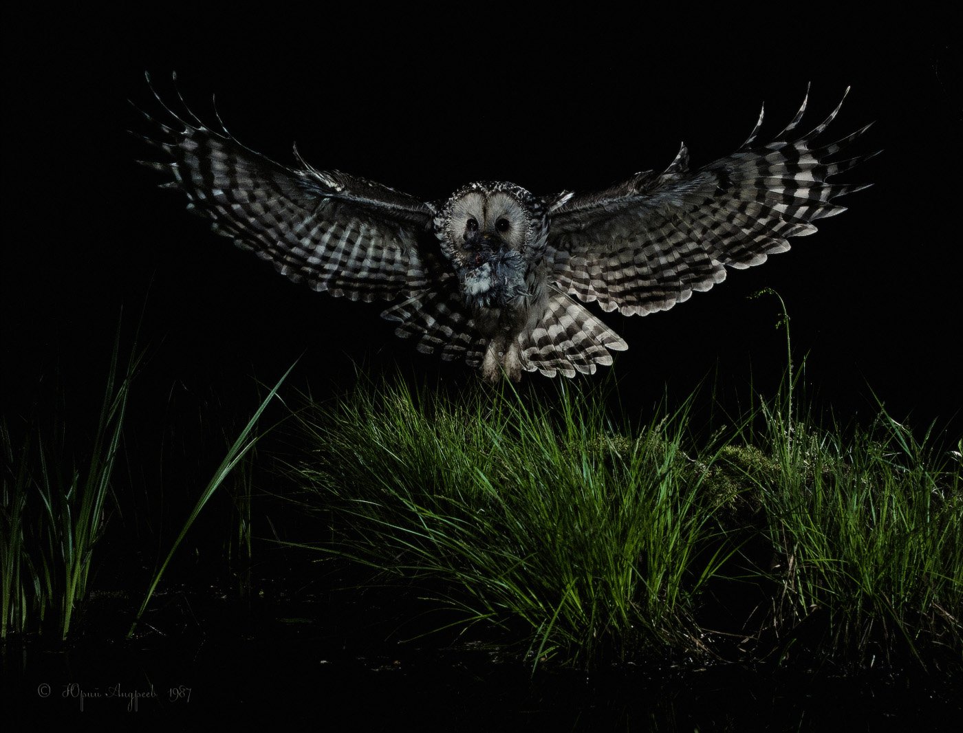 Автоматической фотокамерой зафиксировала отвлекающий момент длиннохвостой неясыти, побудивший её снизиться и произвести нисходящее планирование.