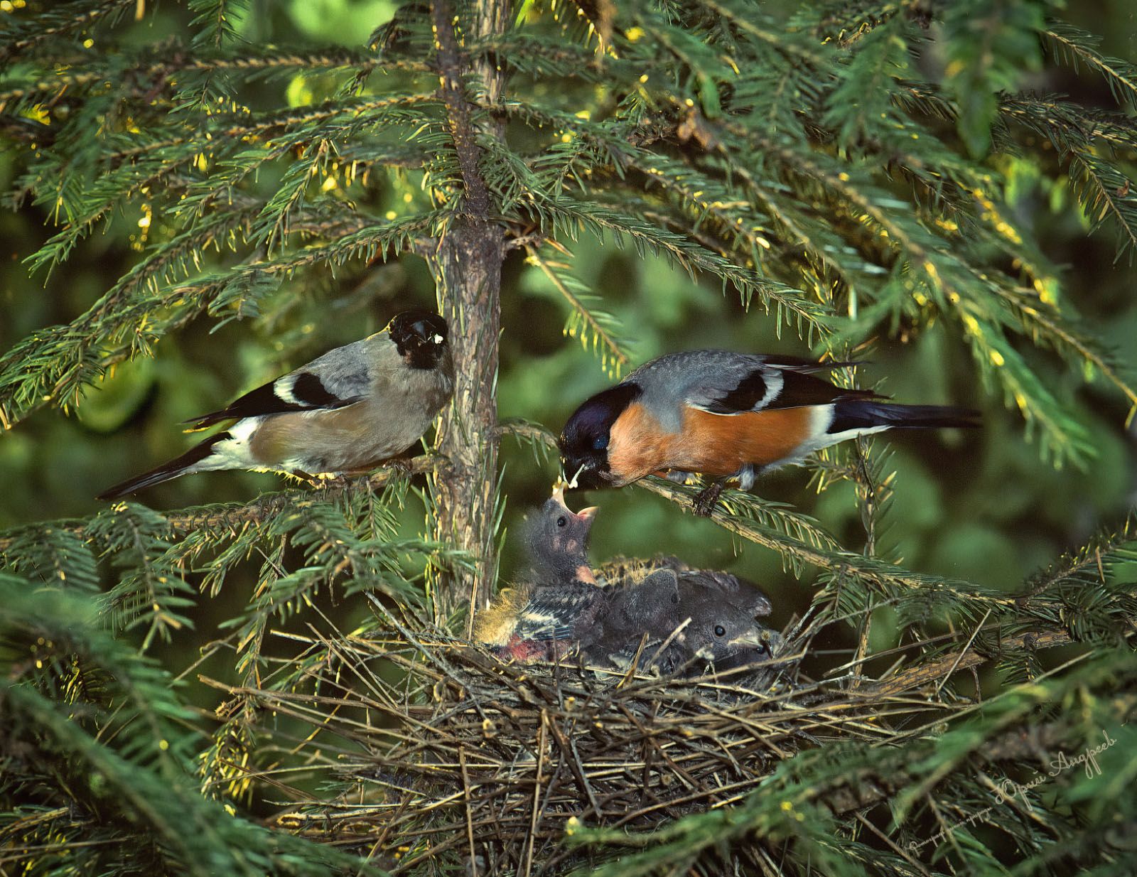 снегирь, гнездо, птенцы, фауна, ель, лето, Юрий Андреев