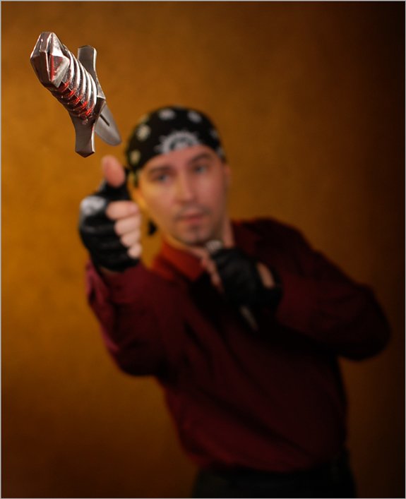 нормально повесили, натуралестичненько, можно было ножику чуть размытия дабавить, чтобы небольшой смазик был, типа скорость :) Хотя, так смотрится как будто сверх скоростная камера сфотала :)