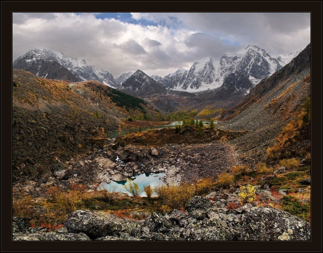 Алтай. Вид на Верхнее Шавлинское озеро с морены, которая и отделяет его от Ниженего. Вся вода уходит под эту морену и через км снова появляется. 2 кадра.