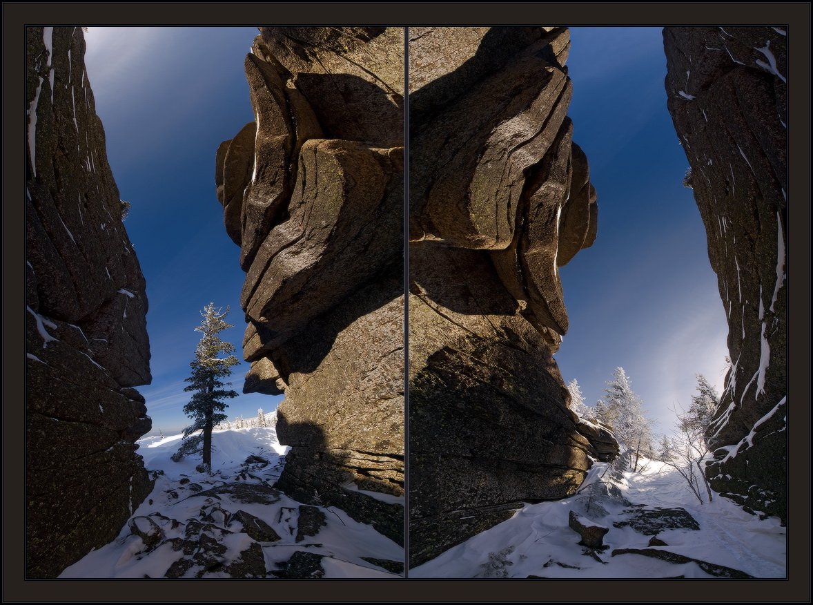 Одна из скал у горы Курган (Крест) имеет расщелину. Сначала сделал панораму по вертикали около 200 гр, потом разрезал на две части, каждая из них около 120 гр. и поставил рядом для наглядности. Всего ушло 17 кадров.