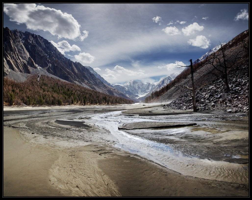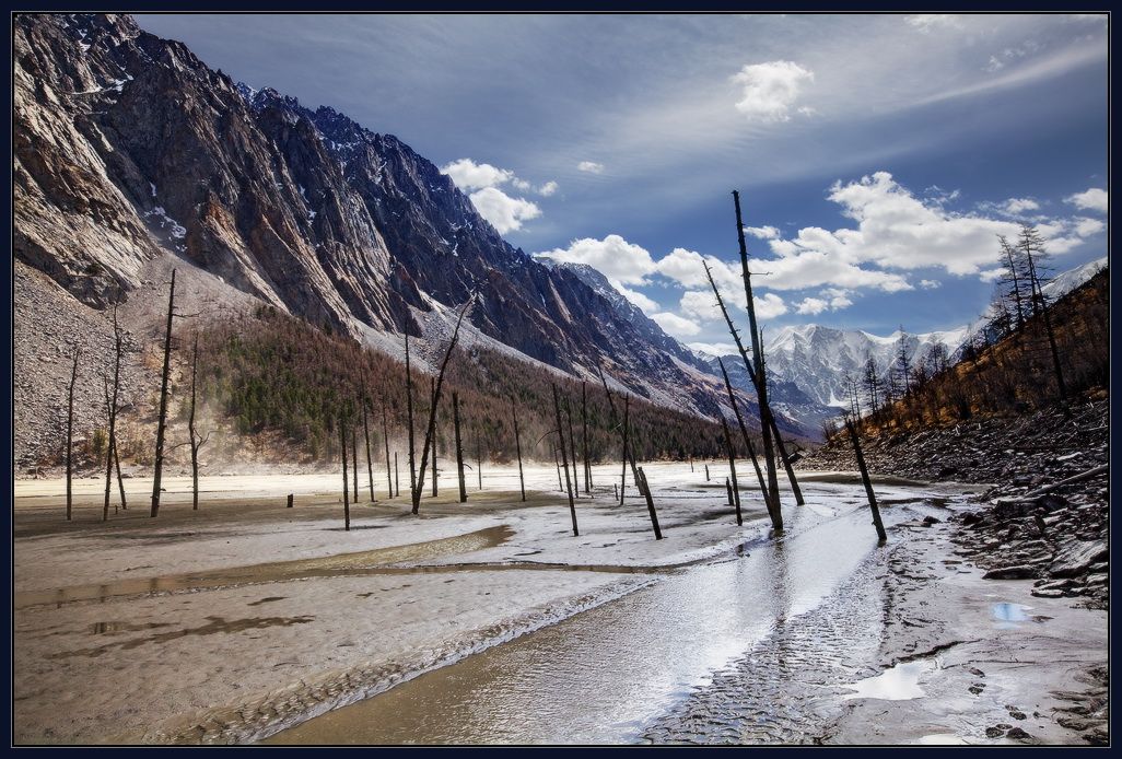 Обмелевшее озеро Маашей. На дальнем плане ветер поднимает песок в виде небольших завихрений. Можно ходить прямо по дну озера, перепрыгивая через небольшие ручейки.