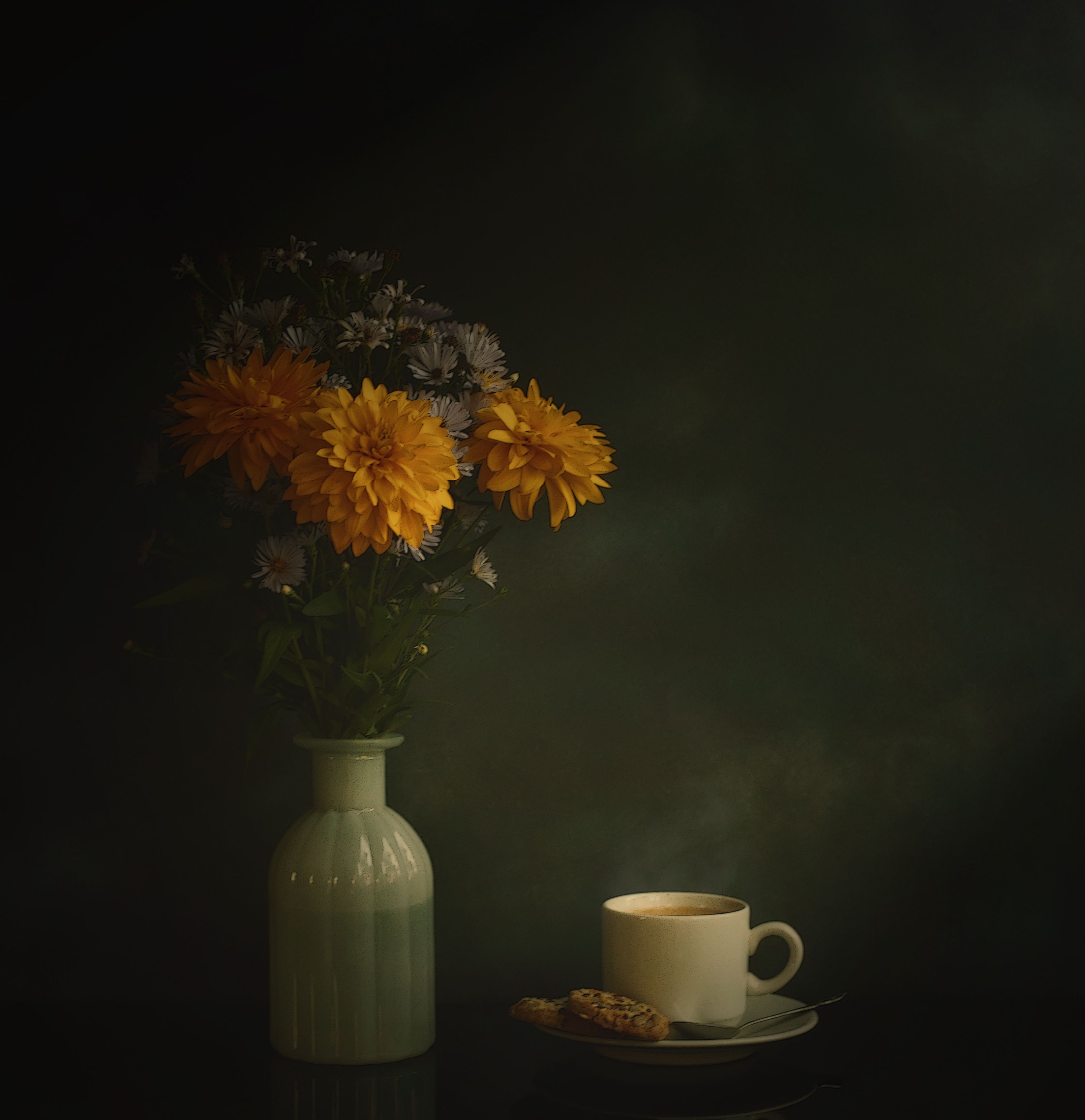 coffee, cookies, flowers, still life,цветы, натюрморт, фото натюрморта, еда, кофе, печенье, чайник, утро, темно, легкий, затемненный, напиток, закуска, ваза, Стасов Виталий