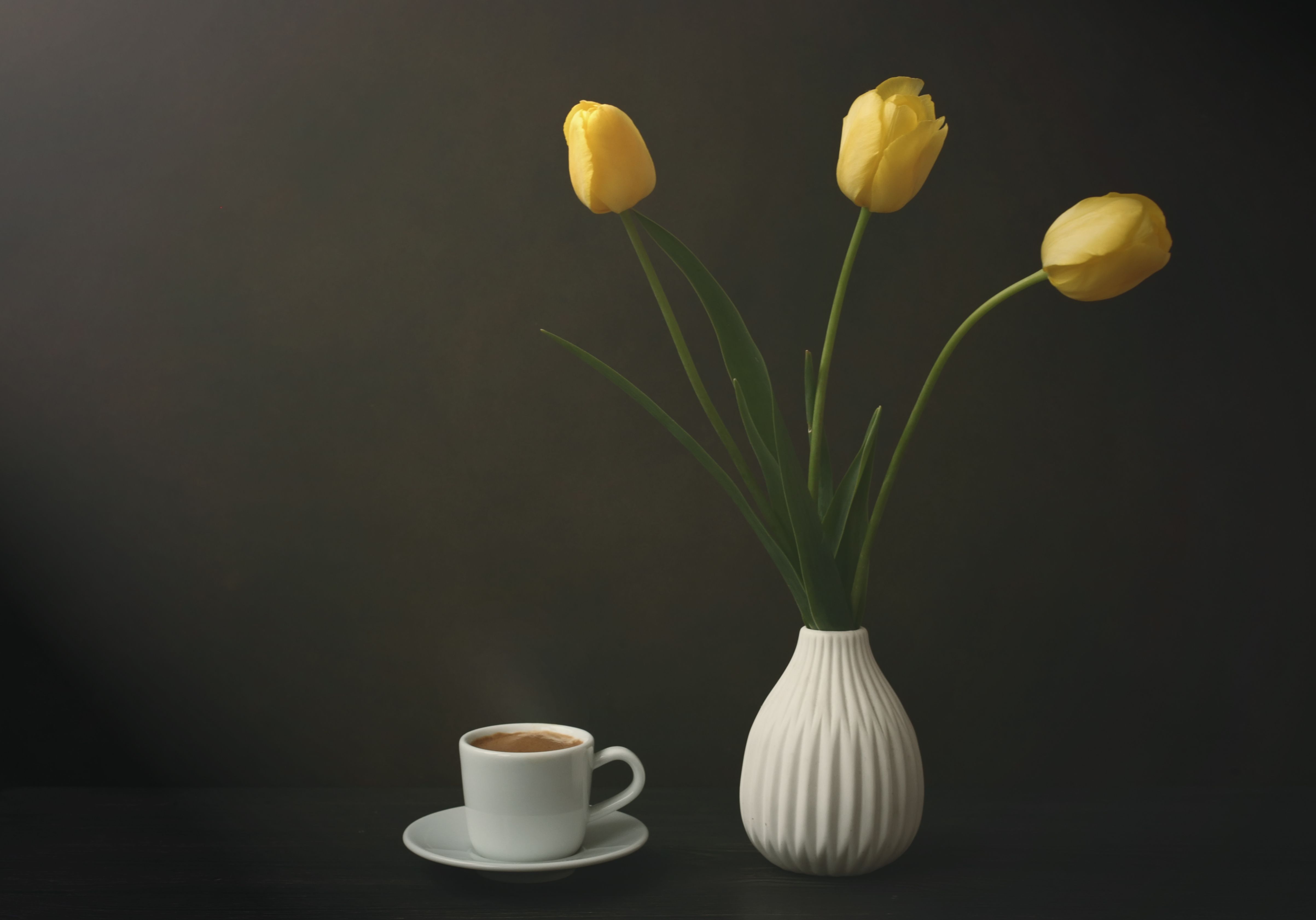 темный фон, чашка, ваза, натюрморт, тюльпан, чай,dark background, cup, still life, flowers, кофе, желтые тюльпаны, Стасов Виталий