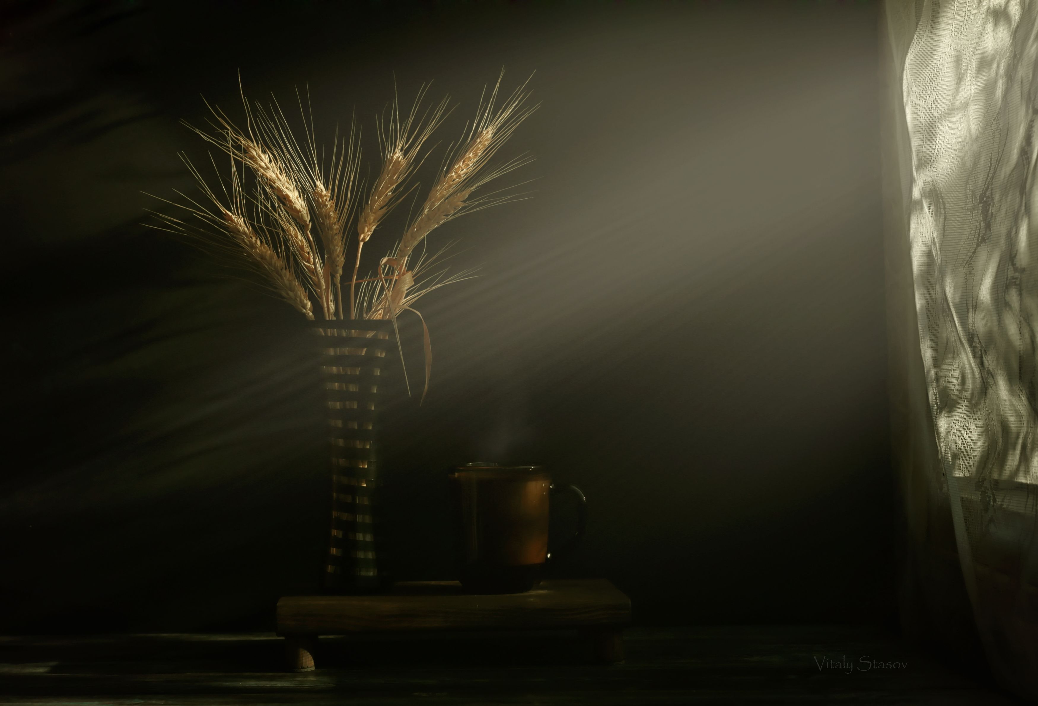 Луч света и кофе. Натюрморт на черном фоне. Натюрморт. На темном фоне.. Колоски ржи в вазе.Still life black background. Still life. On a dark background.. Spikelets of rye in a vase.