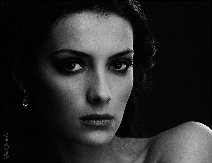 Все просто: объектив 70-200/2,8; камера - значения не имеет в общем-то (1Ds Mark III). Свет: рисующий - стрип-бокс (40*120), моделирующий (линия скулы, плечо, волосы) - рефлектор с сотами. Свет импульсный. Обработка: кривые (увеличить контраст), перевод в чб, псевдозерно. Все. :)