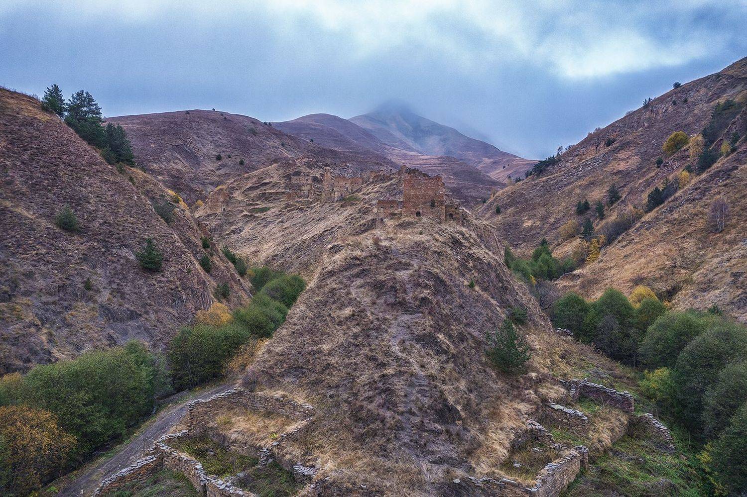 Башенный комплекс Никарой, Чеченская республика. Из Википедии: "Никарой отдельный башенный комплекс датируется XIV веком. Располагается в высокогорном районе Терлоевского ущелья на юго-западе Чеченской Республики, в бывшем селении Никарой, расположенного на территории горного Галанчожского района. Башенный замок возведён на узком труднодоступном скальном гребне в междуречье двух рукавов реки Никар-эхк, закрытом с трех сторон горными массивами. Расположен на высоте 1800 метров над уровнем моря". https://ru.wikipedia.org/wiki/Никарой_(башенный_комплекс)