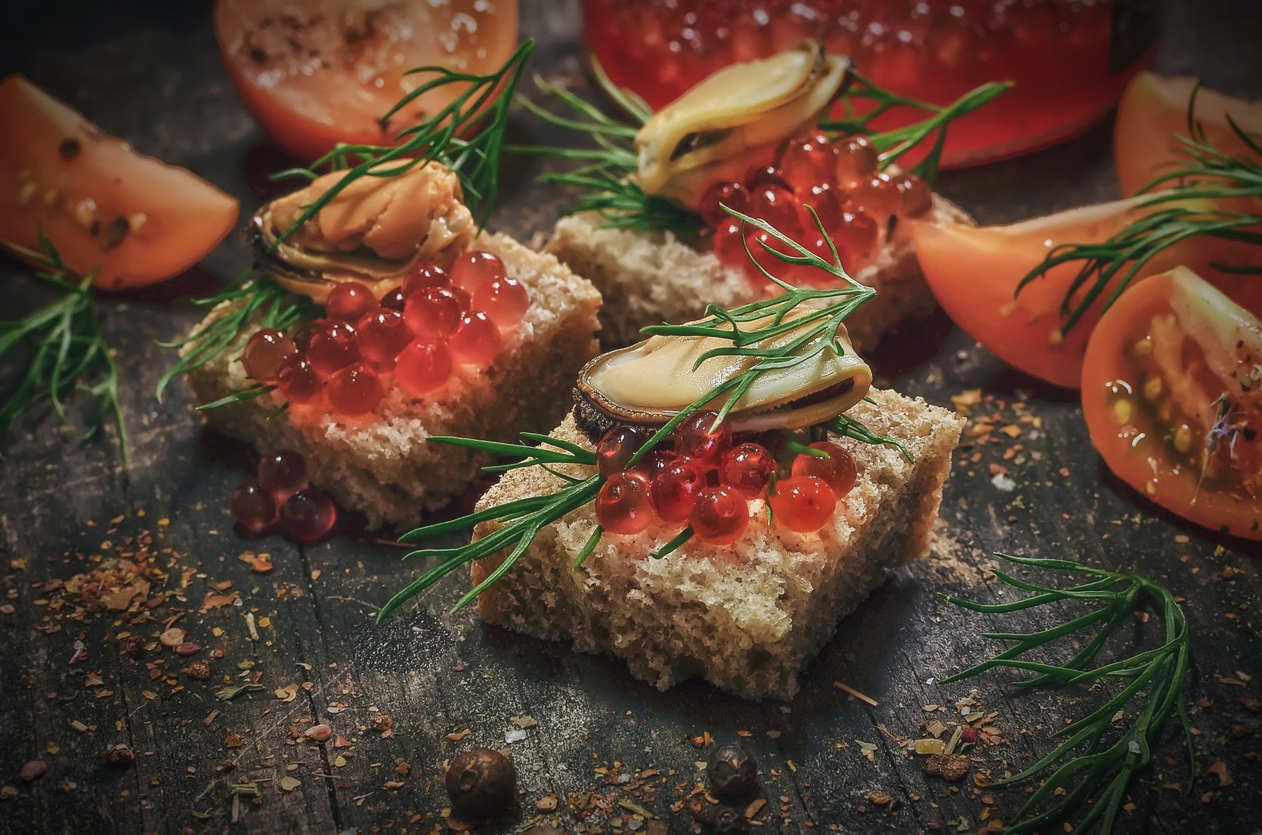 икра,мидии,хлеб,укроп,закуска,помидор,специи,красный, Владимир Володин