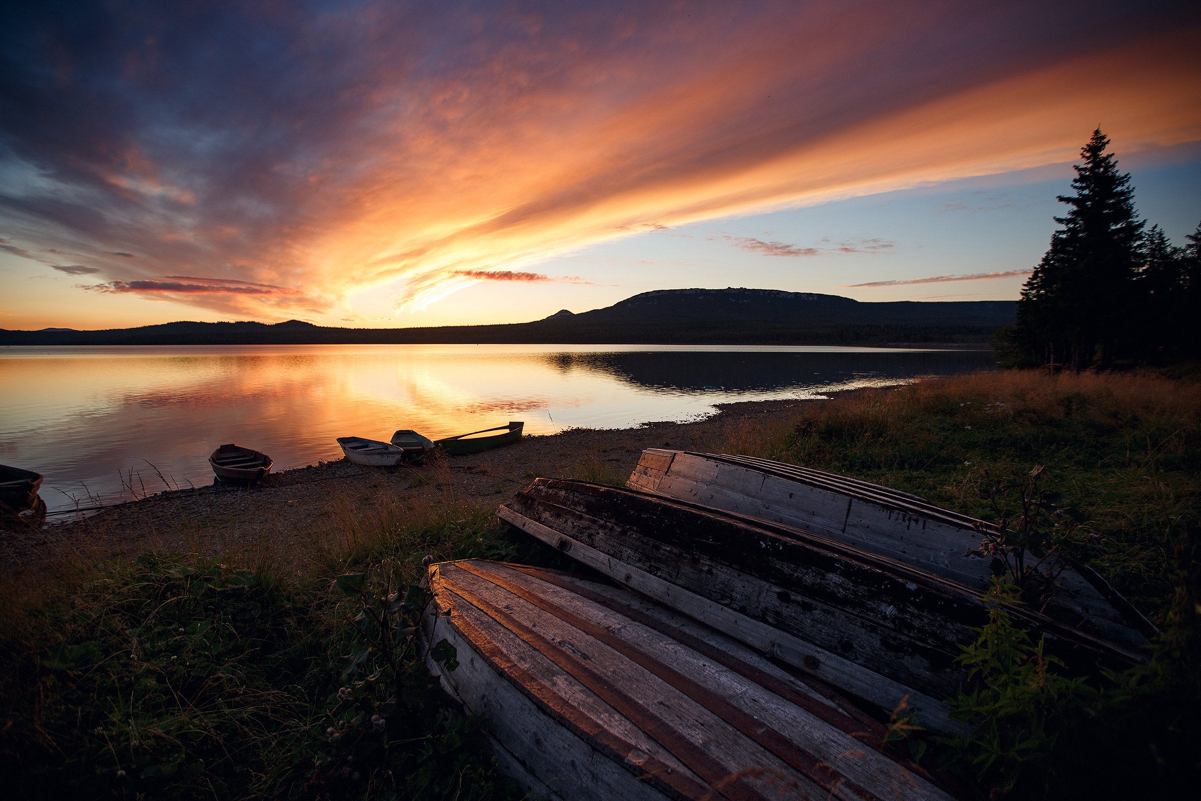 Зюраткуль, лодки, закат, лето, Южный Урал, горы, Владимир