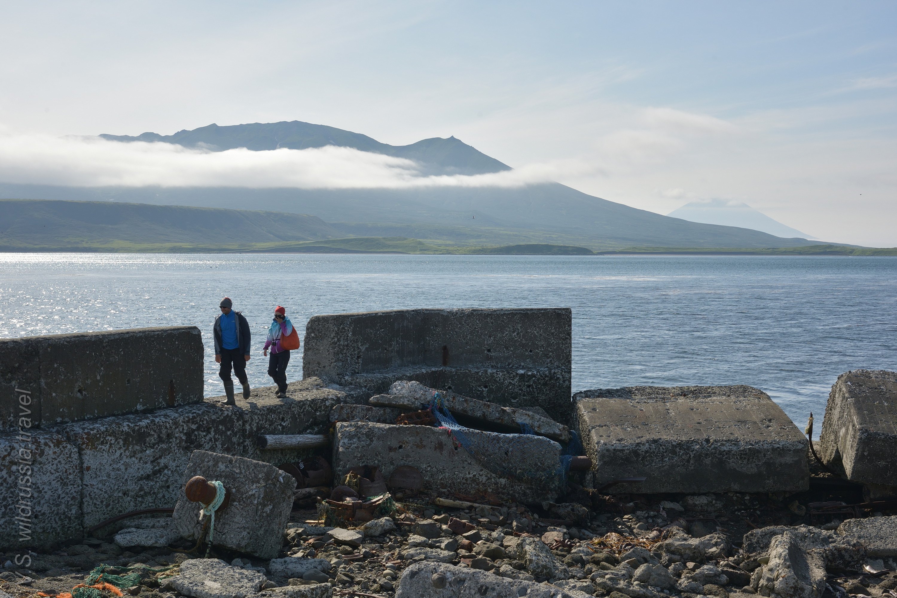 Курилы, Курильские острова, Камчатка, экспедиция, шагнивнеизведанное, путешествие, берег, пара, горы, вулкан, море, причал, бетон, разруха, руина, Владимир Столяров