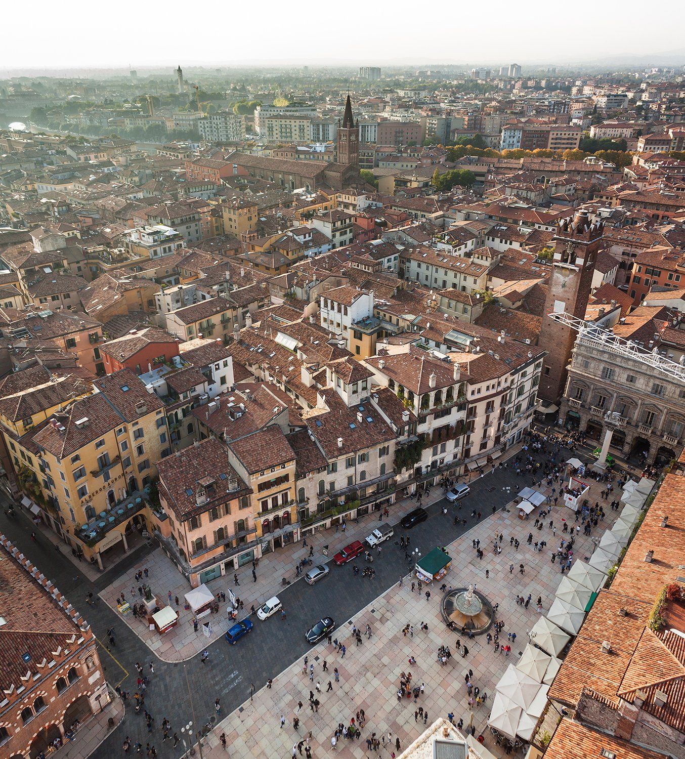 Смотреть на город с высоты башни Ламберти - отличное занятие в Вероне для тех, у кого высота не вызывает головокружения. Этому занятию тут можно посвятить ни один час. Сначала вы любуетесь общим видом, потом начинаете вглядываться в горизонт, пытаясь разглядеть озеро Гарда, и наконец всецело отдаётесь разглядыванию деталей, в которых вся соль. Здесь и клумбы и грядки на высоте пятого этажа, и любители солнечных ванн, загорающие на крыше, и столики, накрытые к ужину на высоких террасах прямо под открытым небом, и невидимые с улицы барельефы, помнящие ещё венецианское владычество, и многое-многое другое...)