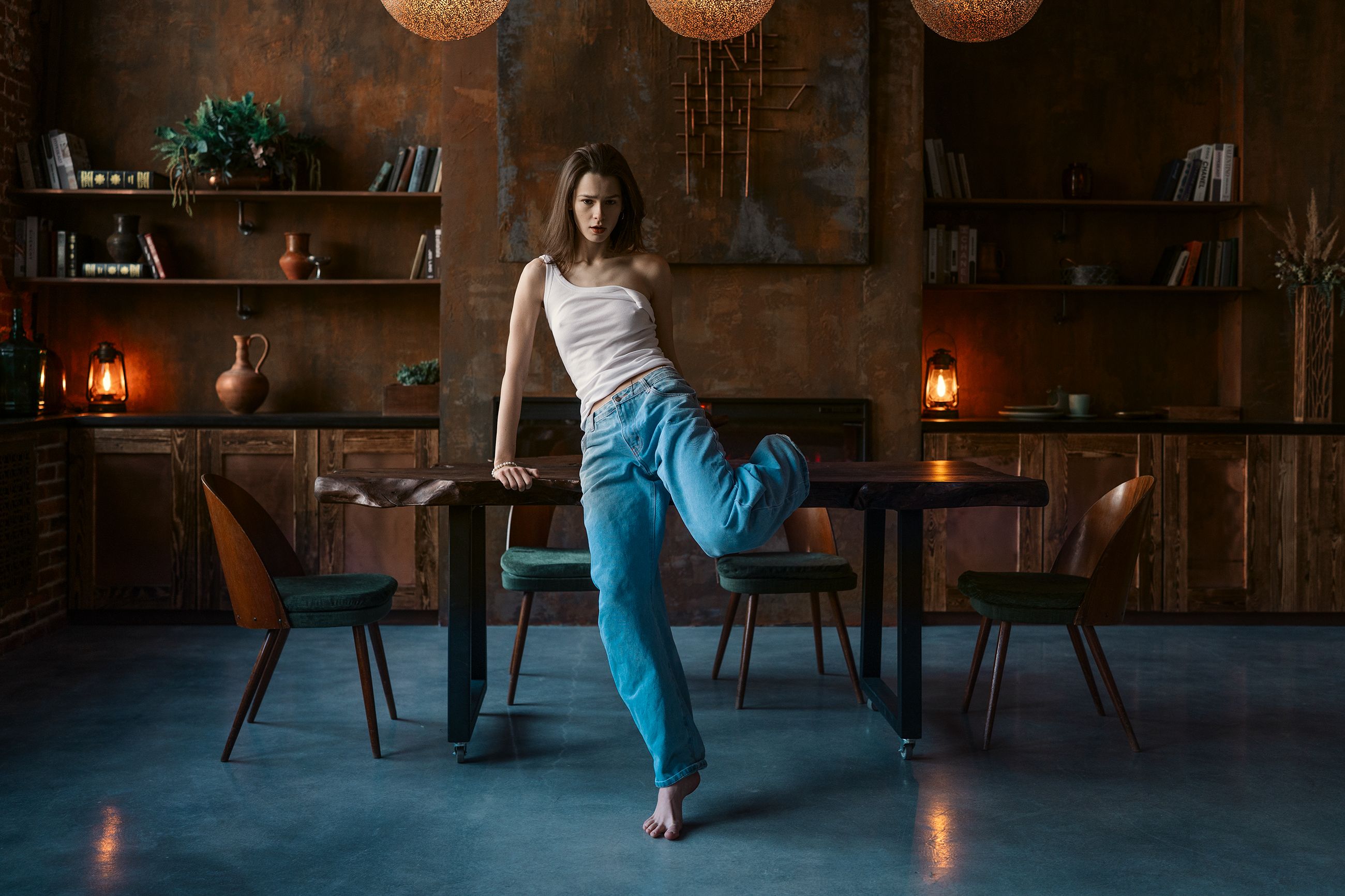 Владимир, снимок получился сильным — композиция выверена, свет создаёт нужную атмосферу, а поза модели выглядит естественно и динамично. Хорошо передано пространство, всё смотрится цельно.
