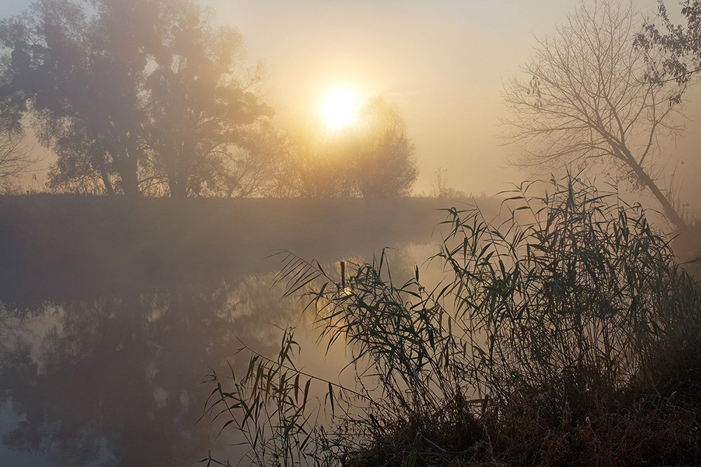 утро, осень, восход, солнце, река, туман, Владимир Костылев
