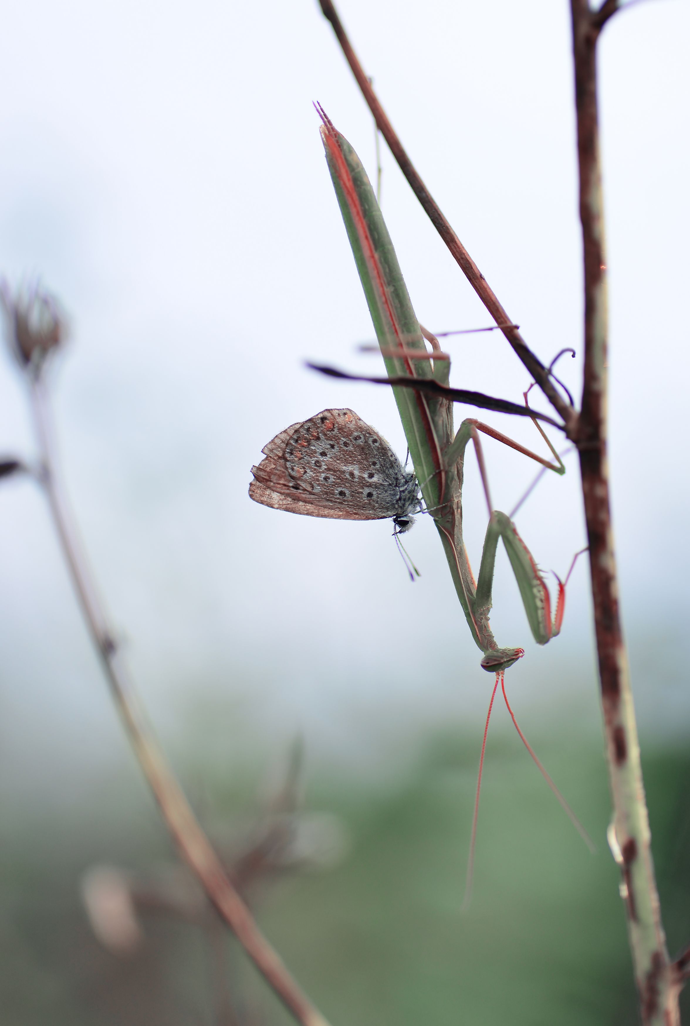 Неужели так бывает?!. У богомола же голова чуть ли не на 180 градусов вращается. Да и не подпускает он обычно объекты такого размера так близко, сразу атакует... :) А работа замечательная, заберу в избранные...