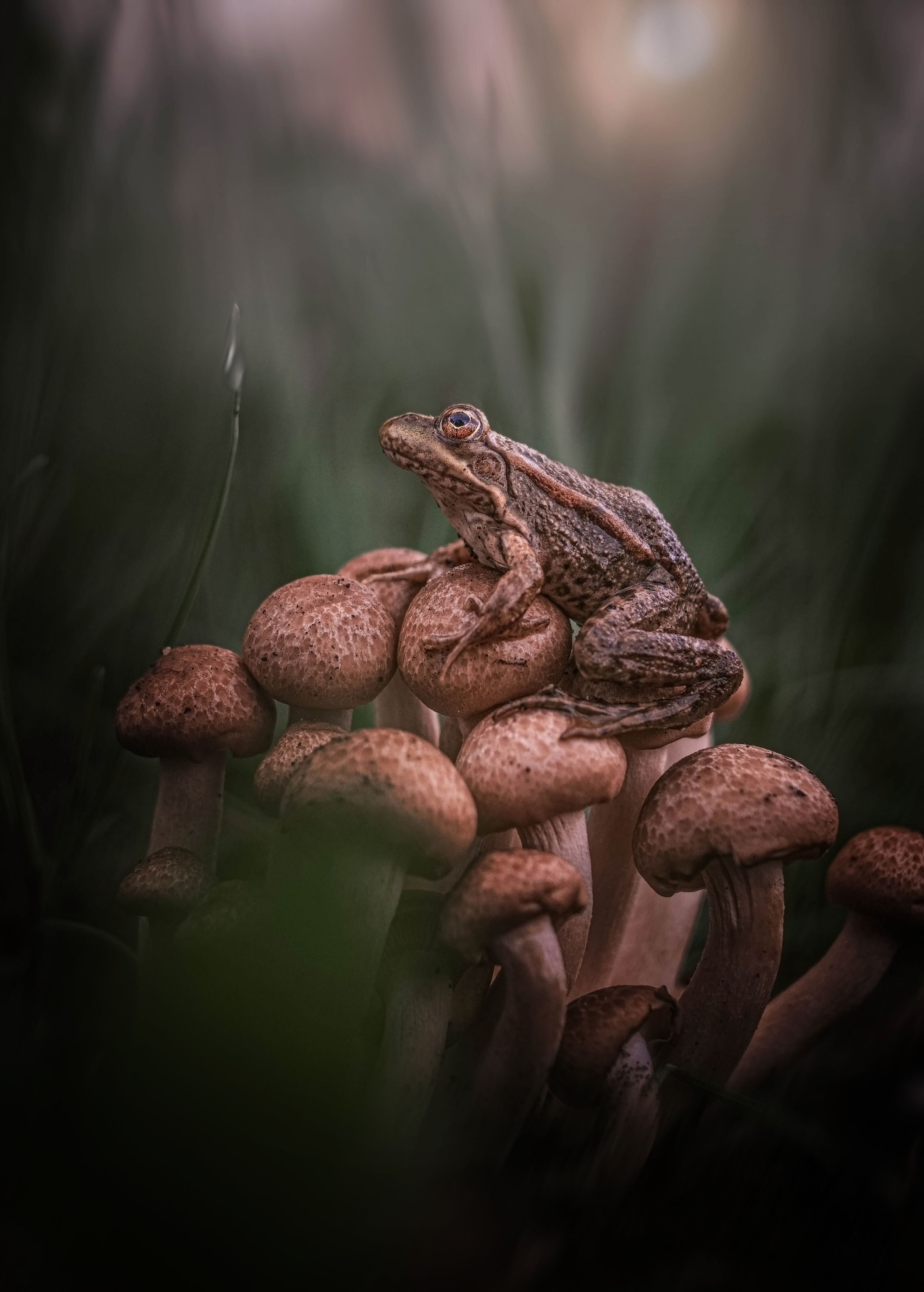 В тихом уголке леса, среди густой травы и влажной земли, лягушка сидит на кластере грибов, словно охраняя их. Её тело, покрытое мелкими бугорками, гармонично вписывается в коричневую палитру шляпок. Свет, проникающий сквозь кроны деревьев, создает атмосферу таинственности и уюта. Фотография передает мгновение спокойствия в дикой природе — момент, когда животное и растение становятся единым целым. Этот кадр — свидетельство тонкой связи экосистемы, где каждый элемент играет свою роль.