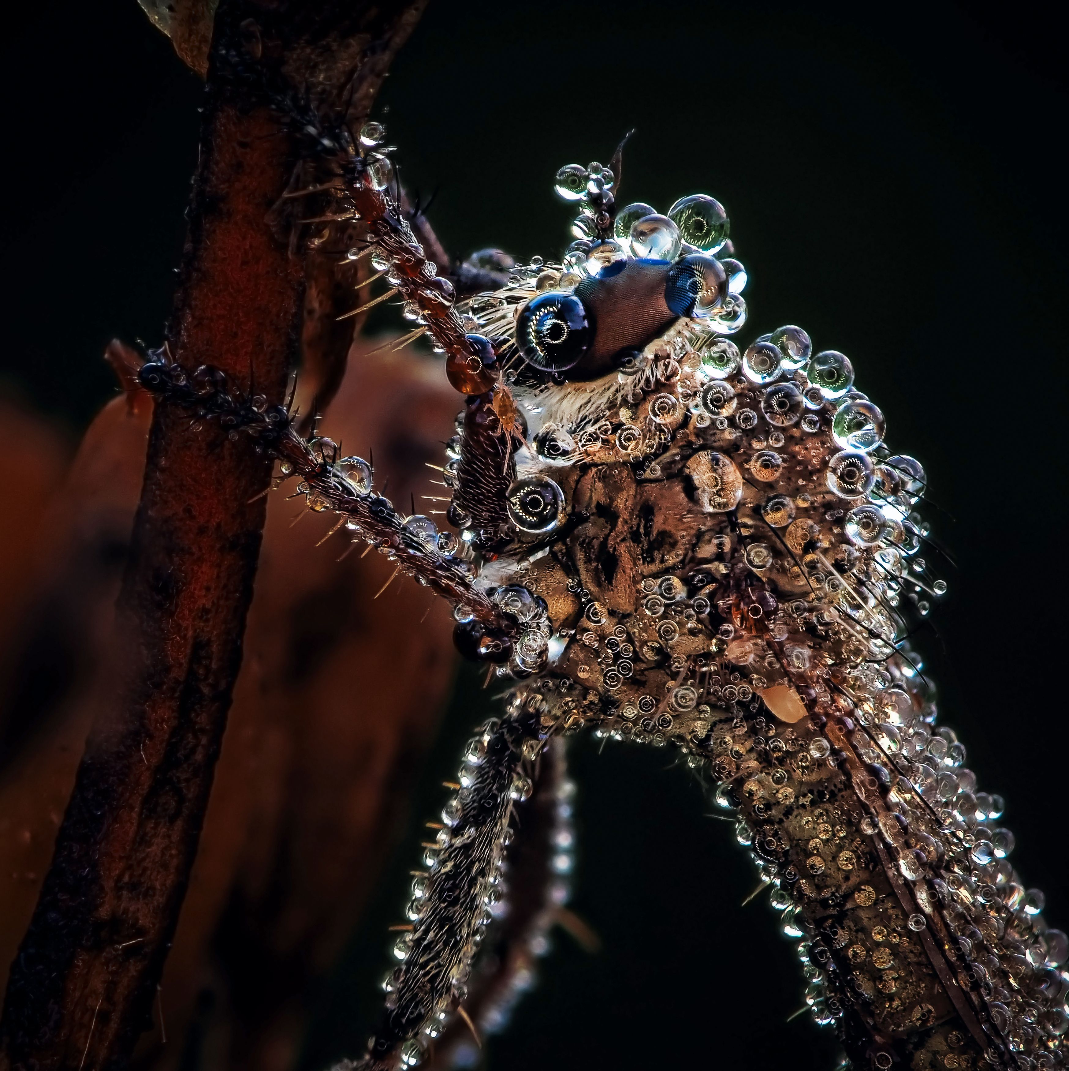 На грани видимого и невидимого — ктырь, застывший в утреннем свете, покрытый бриллиантовой росой. Каждая капля, как миниатюрный мир, отражает свет и тень, подчеркивая текстуру его тела. Макрофотография Лапшиной Владлены превращает обычное насекомое в сказочное существо, напоминая о тонкой красоте, скрытой в деталях природы. Это не просто снимок — это мгновение, в котором жизнь сияет, как драгоценность.