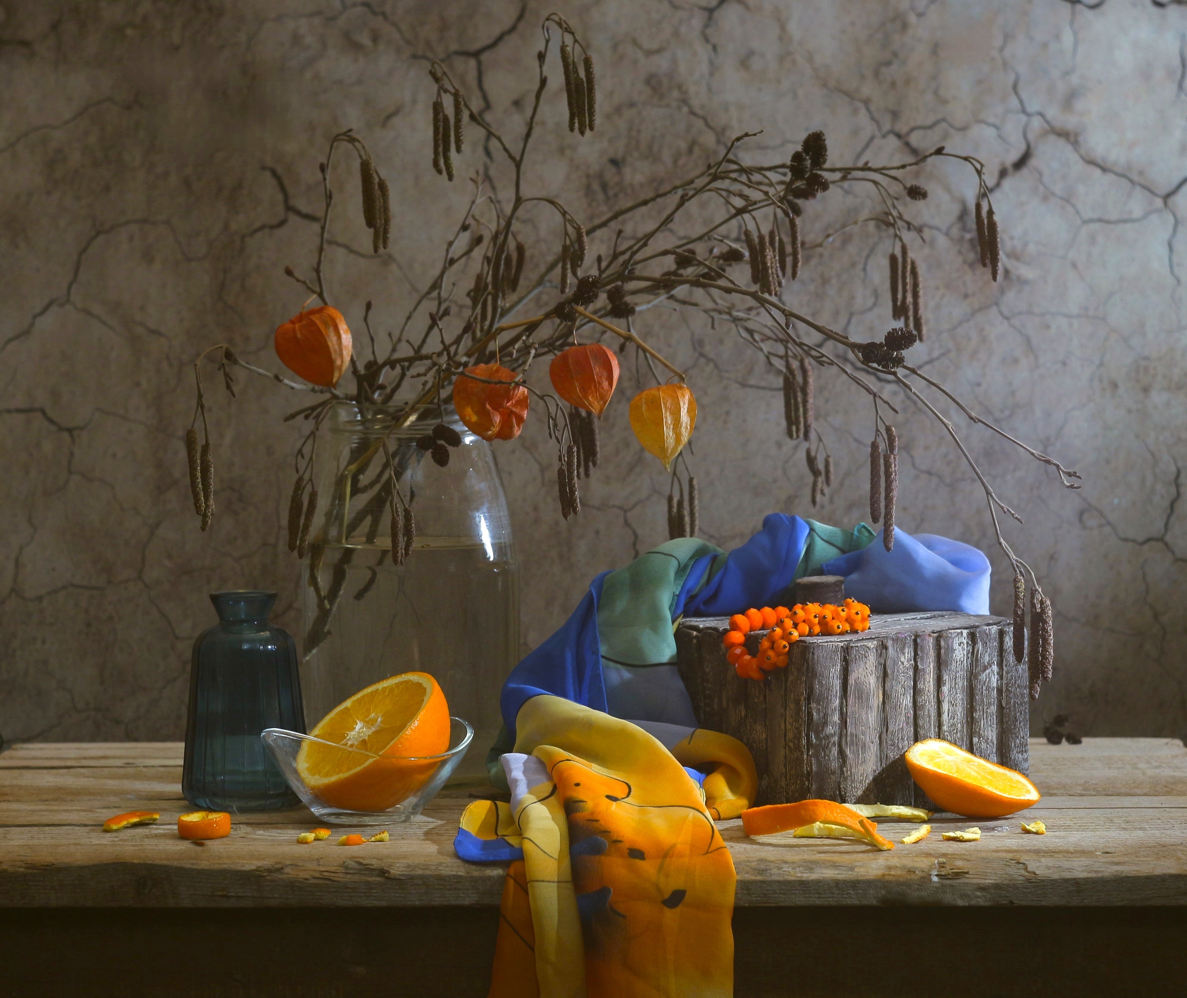 Оранжевый, синий, золотистый — всё играет, как в старинной натюрморте, но с современной душой. Детали — как будто вы случайно застукали момент, когда всё только что было разложено.
