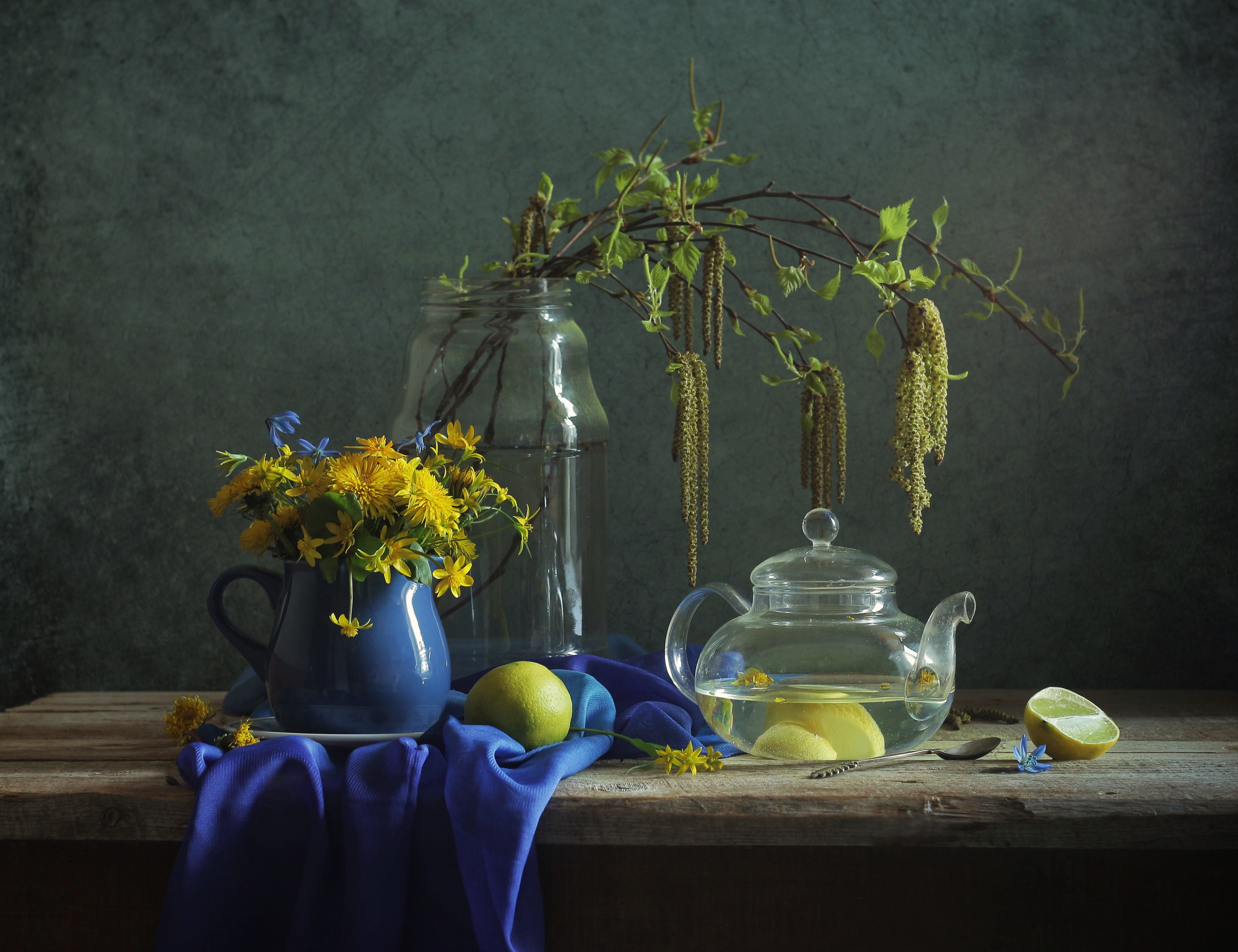 Студийная фотография весны от Людмилы Хрусталевой. На деревянном столе размещена композиция из синего кувшина с желтыми цветами, прозрачного чайника и лимона. На заднем плане видны ветки с листьями в стеклянной банке. Синяя ткань добавляет контраста.