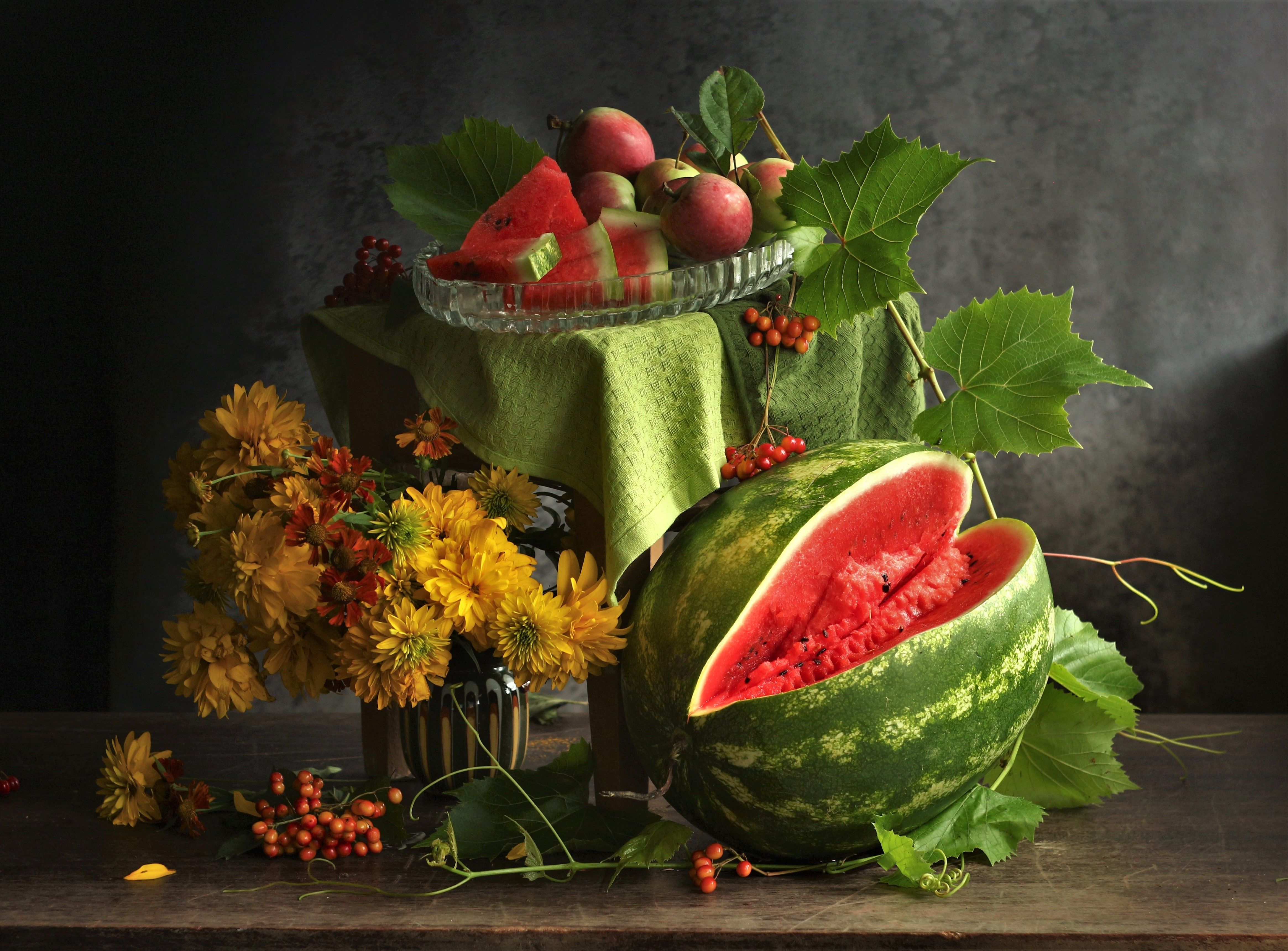 арбуз,цветы, ветка с листьями, Людмила Хрусталева*