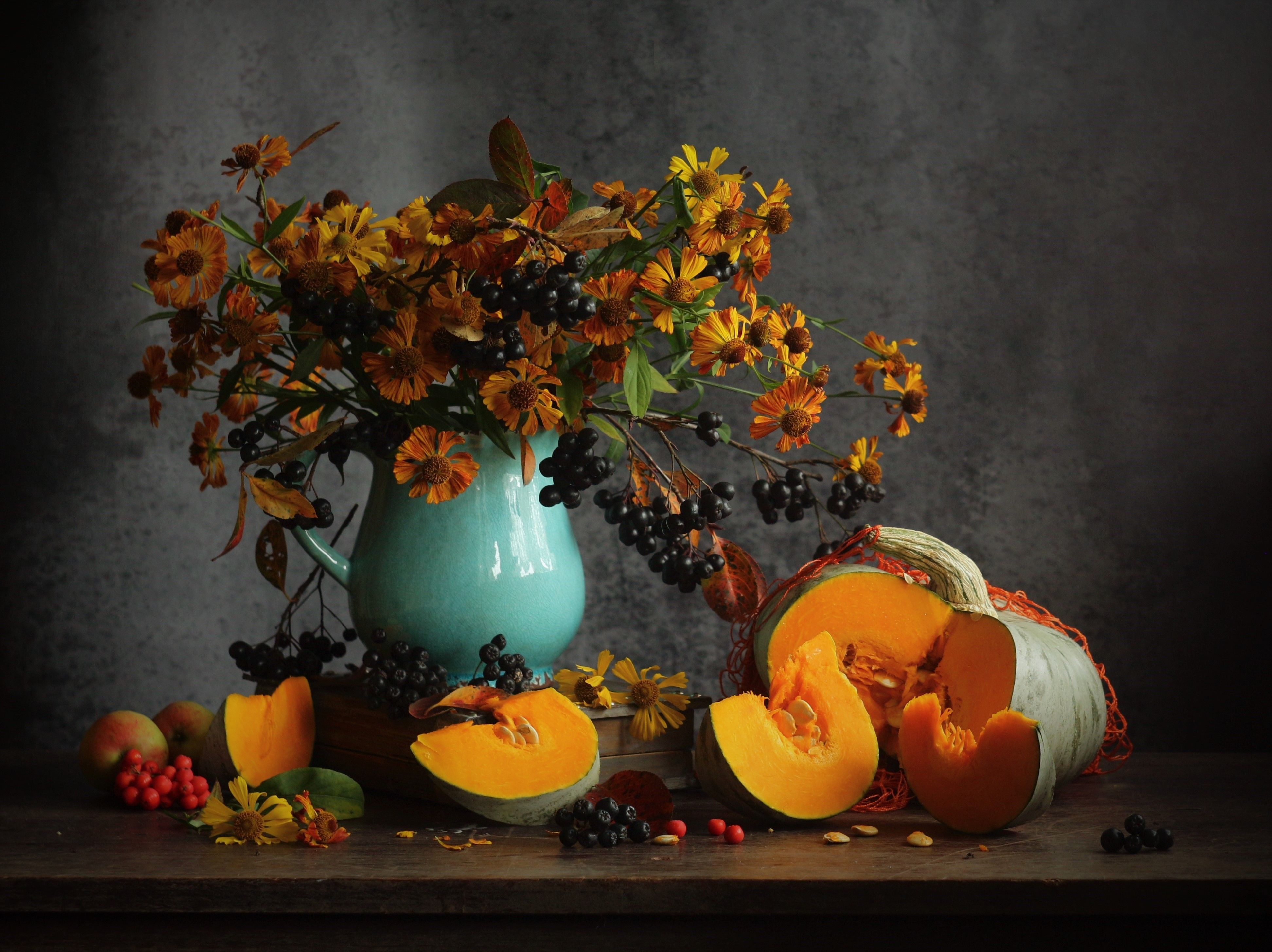 желтые цветы, тыква, голубой кувшин, Людмила Хрусталева*