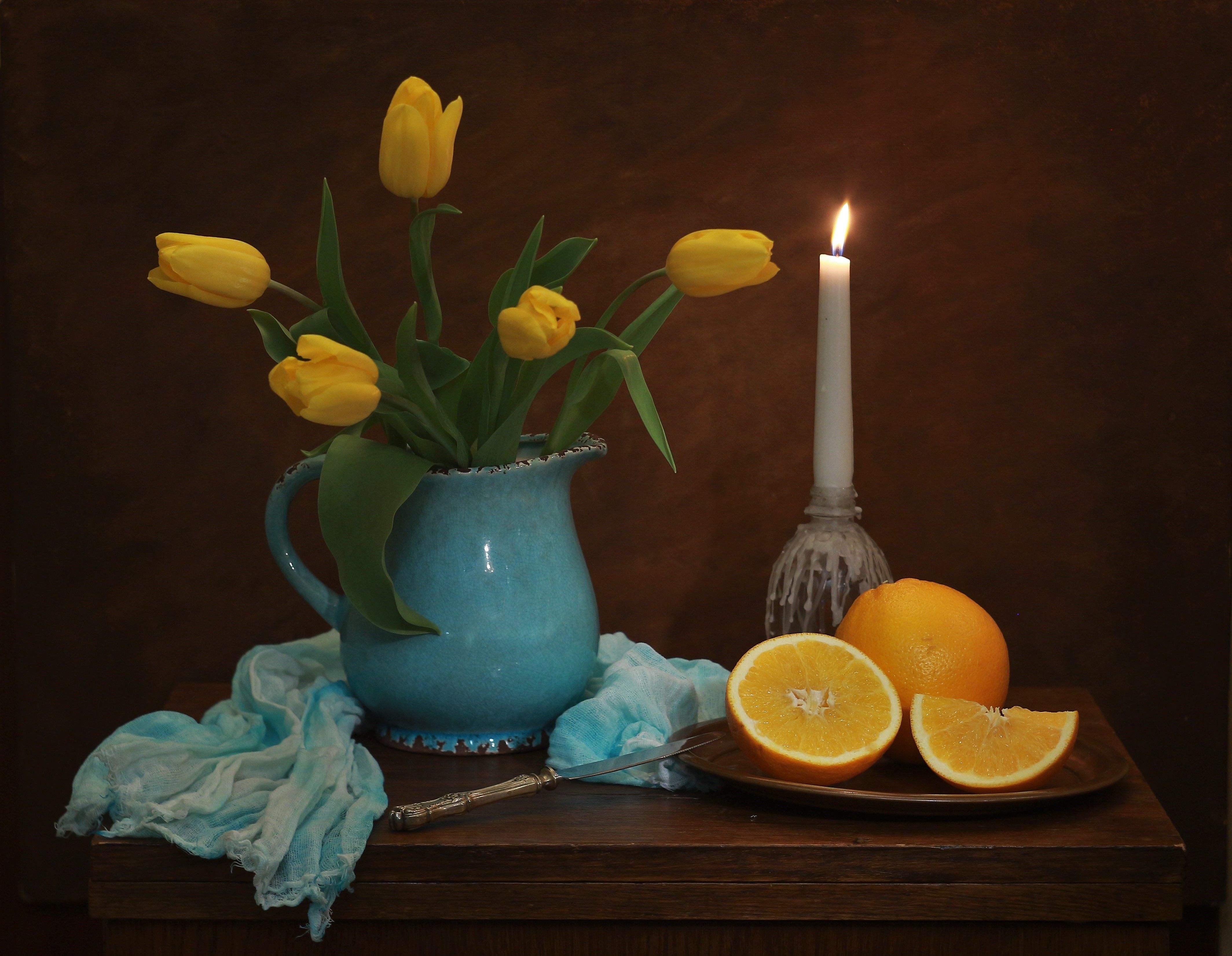голубая ваза, желтые тюльпаны, апельсины, свеча, Людмила Хрусталева*