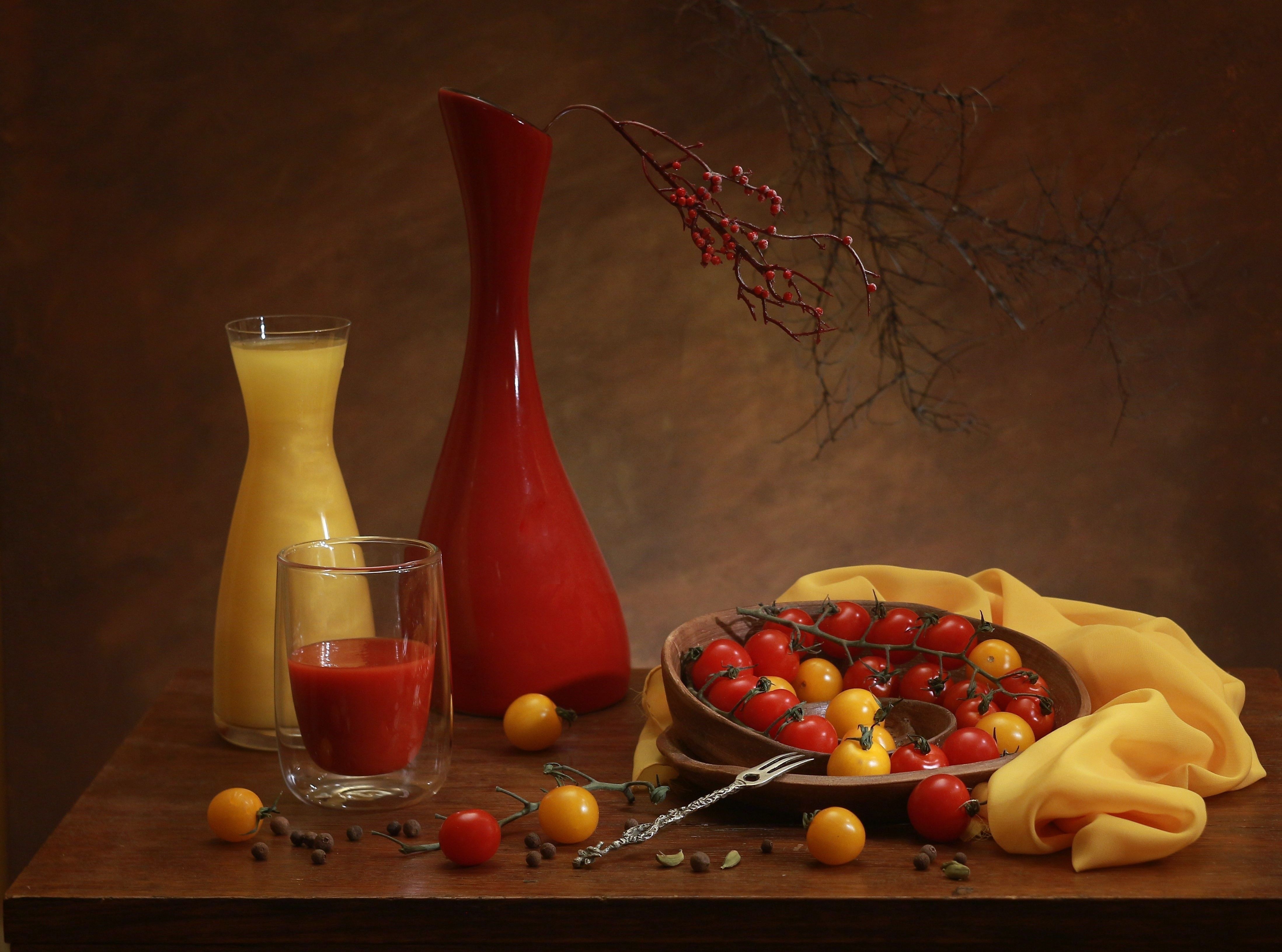 бутылка с желтым соком, красная ваза с ветками, стакан с томатным соком, на блюде желтые и красные помидорчики, Людмила Хрусталева*