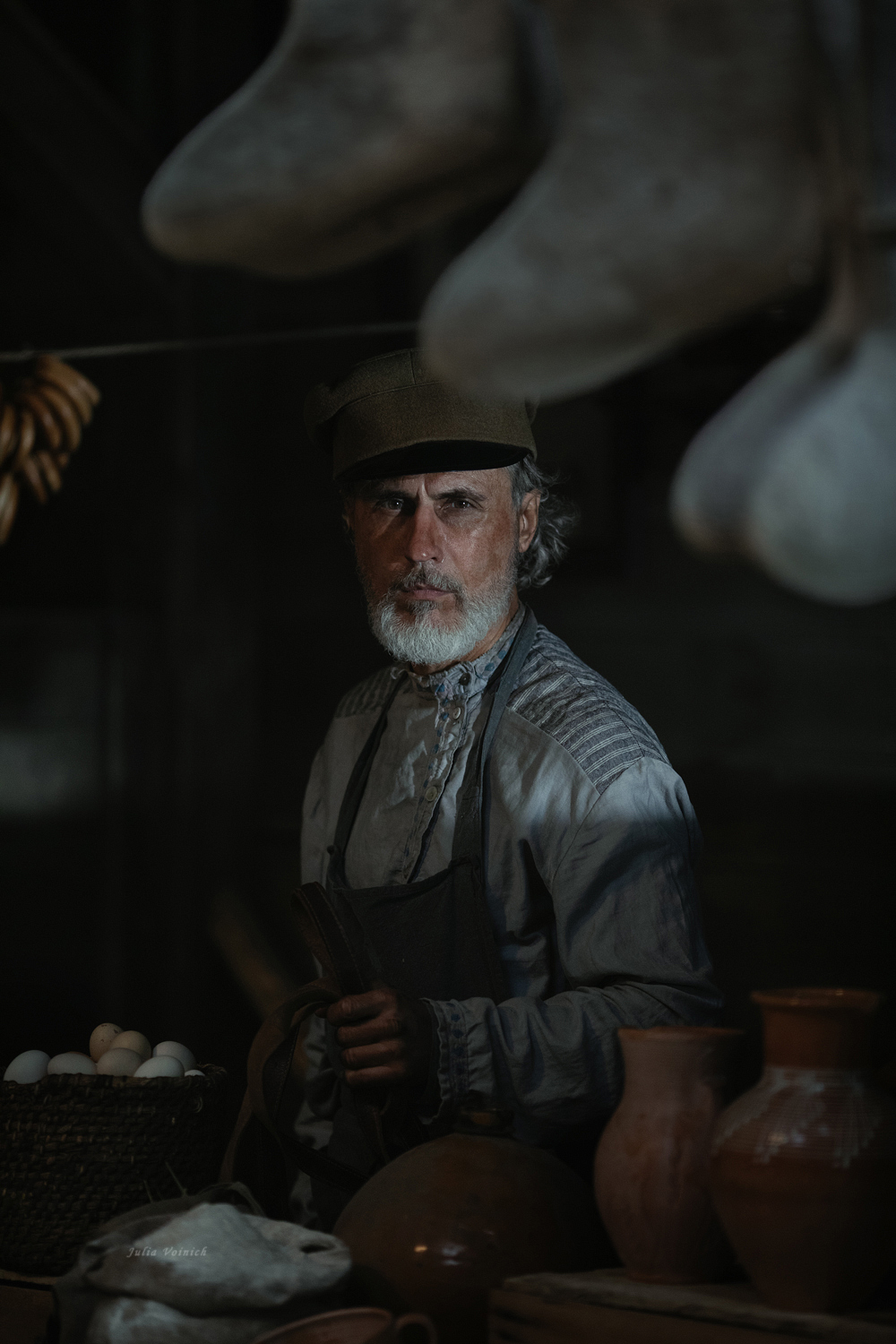 В полумраке мастерской, освещённой тусклым светом, сидит пожилой гончар. На столе — глиняные изделия, рядом — корзина с овощами, висят сушеные луковицы. Его взгляд пронзает пространство, словно вспоминая годы труда. Каждый предмет — часть его жизни и наследия. Фотография передаёт атмосферу уважения к традиционному ремеслу.