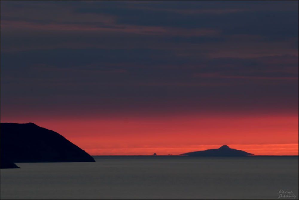 Острова-миражи (находятся за линией горизонта), и иногда (чаще - в холодное время года) появляющиеся на горизонте в створе бухты... В этот раз один из островов принял вот такую форму... Хотя, может это всё-таки не остров? :)))