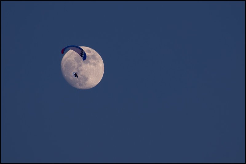 Сразу оговорюсь - парапланериста пришлось чуть "подвинуть", ибо: мы ему махали, свистели, орали, и даже какой-то момент показалось, что он нас понял - начал уверенно перемещаться в сторону Луны прямо на одной с ней линией по горизонту, но чуть-чуть не долетев, где-то на ширину кадра, развернулся, гат... :)
