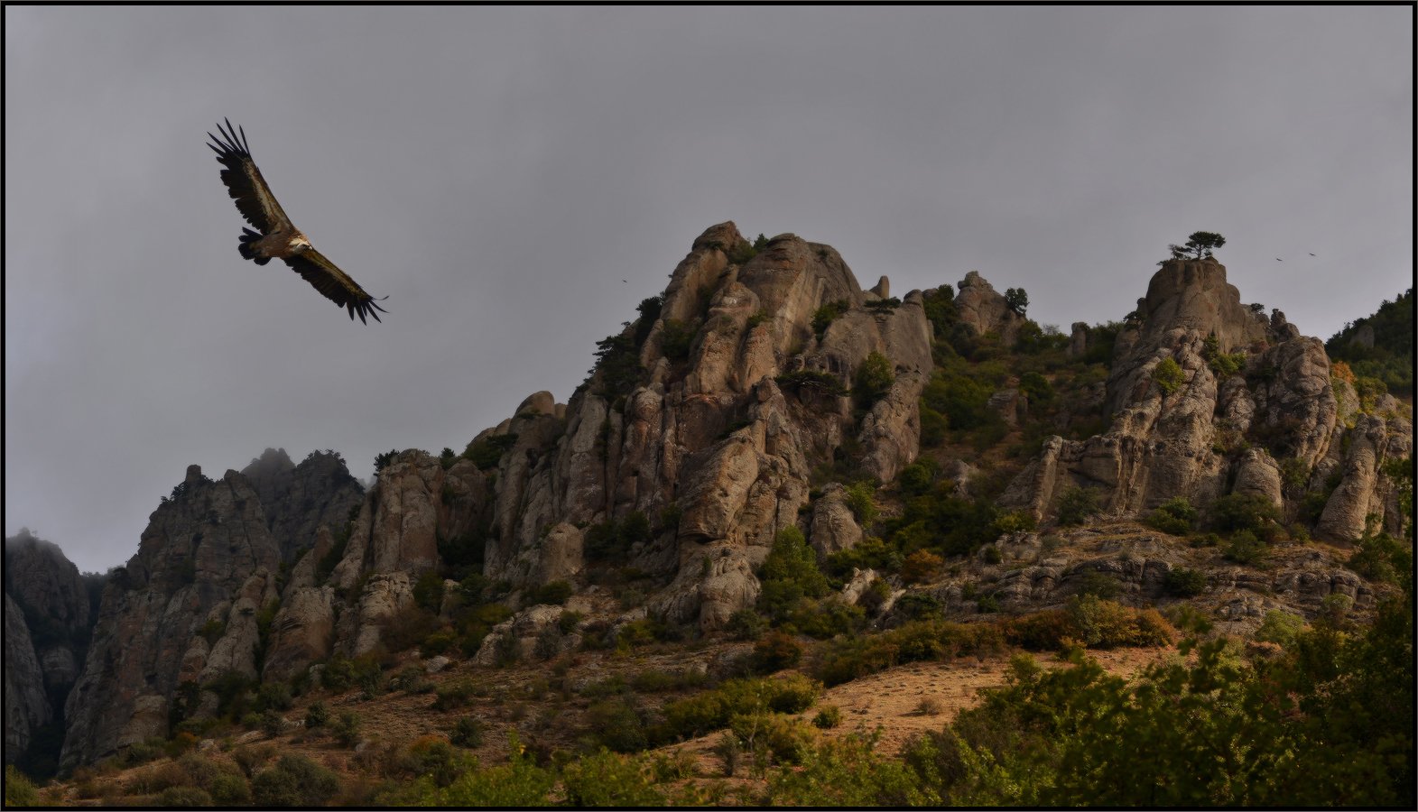 Очевидно, что это панорама из нескольких кадров, один из которых с птицей. Часто приходится прибегать к ФШ чтобы сшить гармоничный кадр, например, чтобы сдвинуть птицу в нужное место. Можно считать считать это коллажем, как и многие мои подобные работы, но птица снята в том же месте и в то же время.