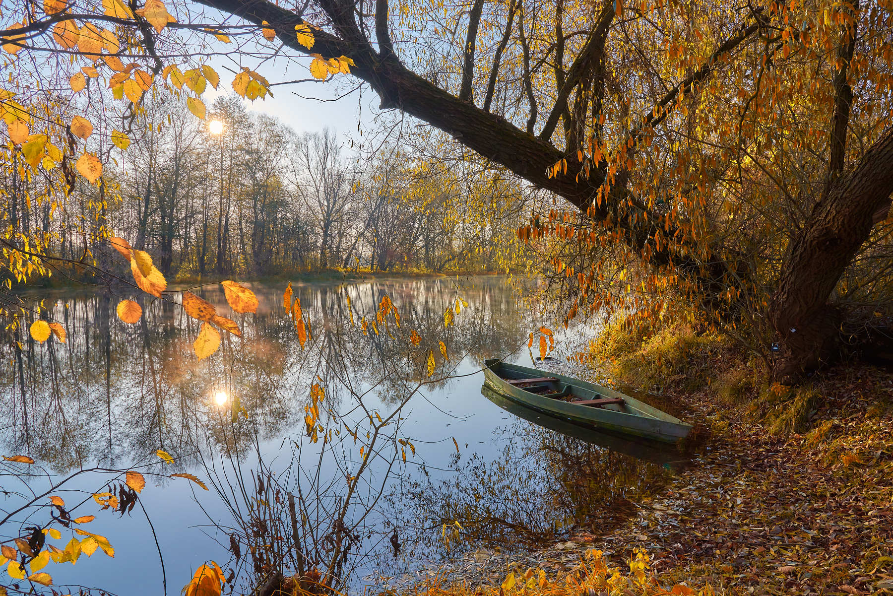 утро, солнце, лодка, осень, река, отражение, Казун Андрей