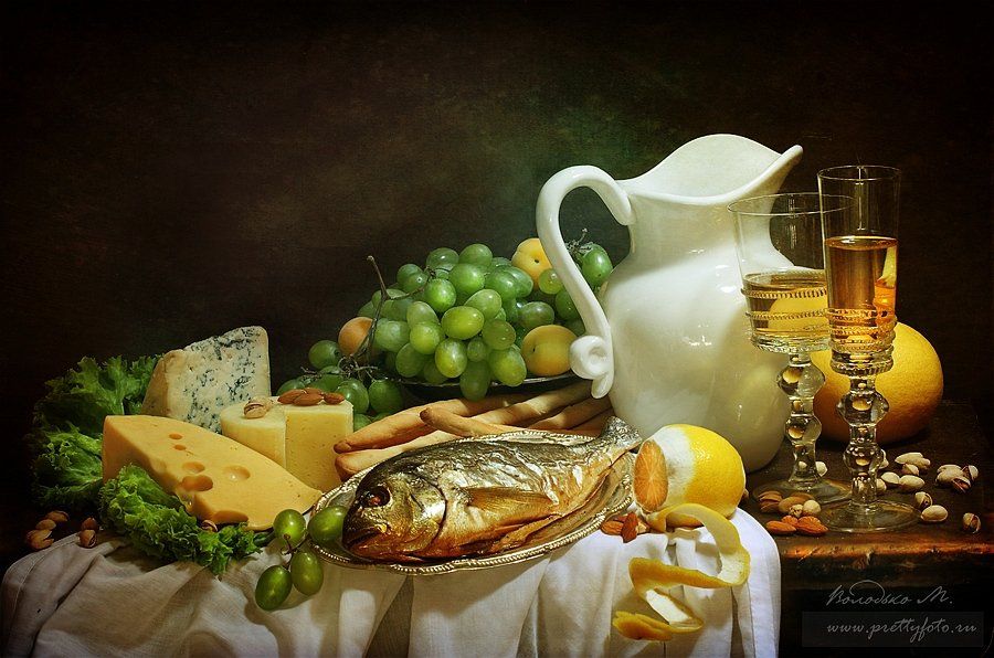 рыба,вино,сыр,виноград,лимон,ужин, Марина Володько