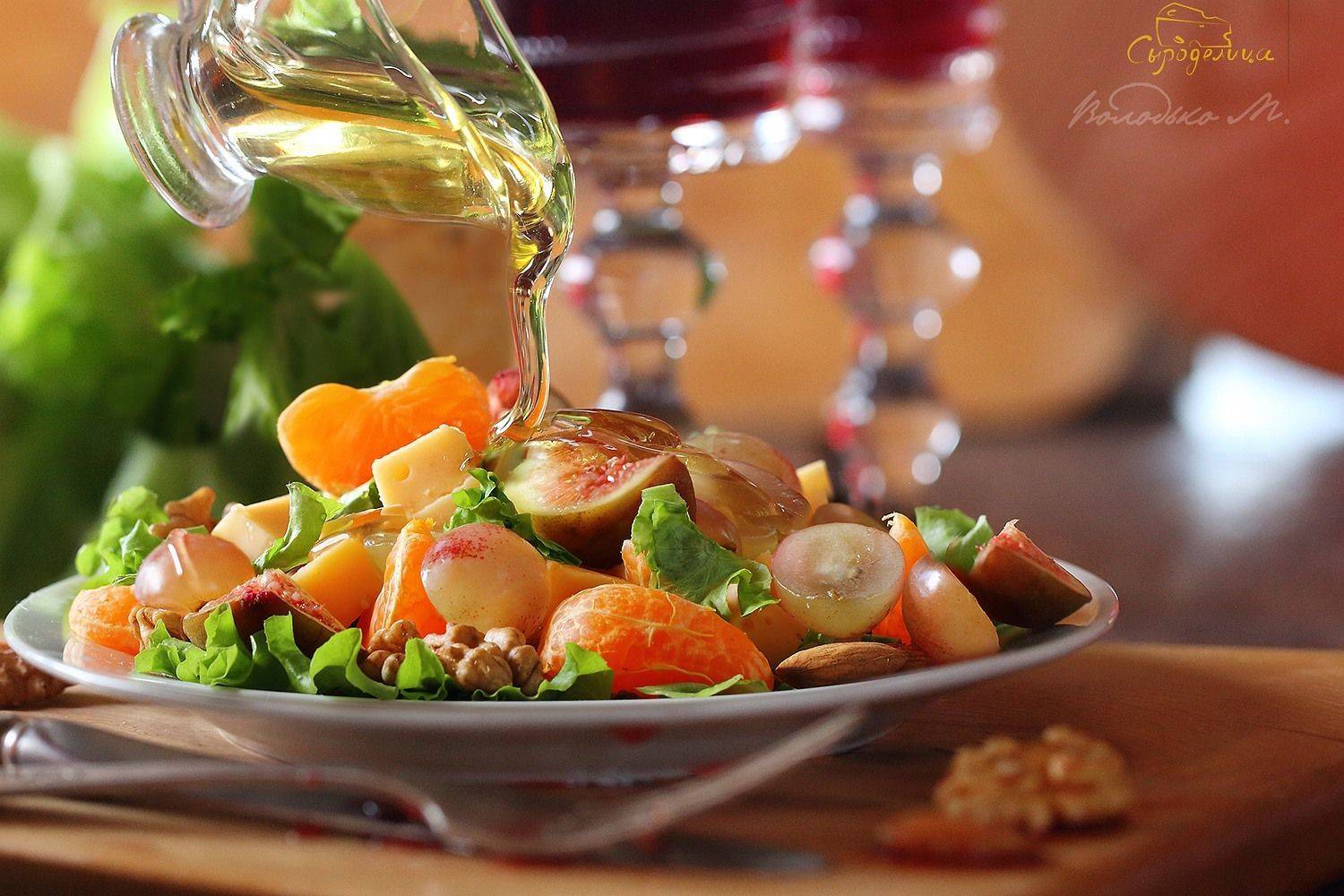 Разрезать пополам крупный виноград и выложить на листья. Дольки мандаринок, инжир и орешки какие вы любите. У меня в данный момент использовались грецкие и миндаль.