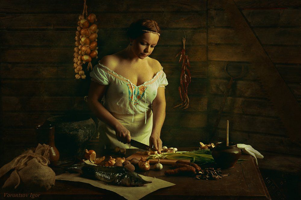 В тёплом, почти театральном свете старинной кухни женщина, одетая в простое белое платье, с умением и заботой нарезает овощи. Каждый её жест — часть повседневной поэзии, где кулинария становится искусством. На стенах висят лук и перец, на столе — свежие овощи и рыба, словно приглашая в мир, где время течёт медленно. Фотография Воронцова Игоря передаёт не просто сцену, а атмосферу, в которой традиции живы и вдохновляют.