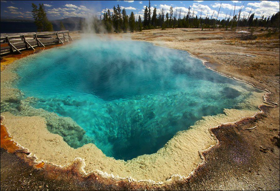 Yellowstone National Park находится под древним огромным вулканом (извержение было примерно 640 000 лет назад) , отсюда и термальные источники вроде этого и гейзеры. Источники разные по глубине, 6-24м, температура в них около 90 градусов по Цельсию. Цвет бассейнов - из-за теплолюбивых микроорганизмов - термофилов. Black Pool (at West Thumb Geyser Basin) раньше и впрямь был чёрным, отсюда и название. Кстати, места весьма токсичные.