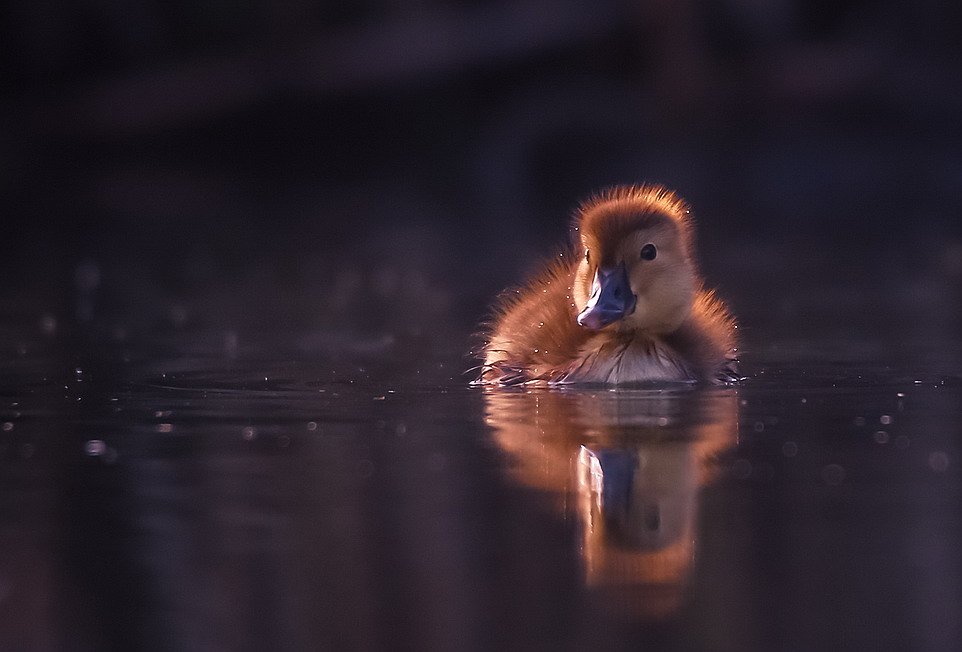 На тихой поверхности воды плавает маленький утенок, его пушистое тельце и острый клюв отражаются в темной глади. Сцена снимается в сумерках — свет мягко подсвечивает пух, создавая контраст с тёмным фоном. Фотография передаёт умиротворение и хрупкость природного момента, застывшего в кадре. Вячеслав Мищенко запечатлел не просто птицу, а мгновение жизни, полное тишины и гармонии.