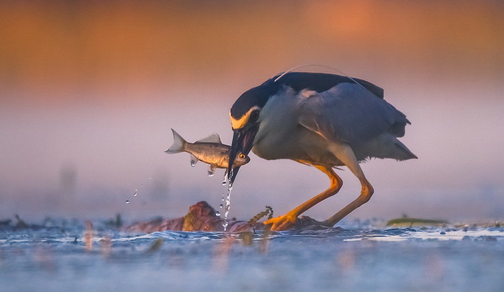 На мелководье в тёплых оттенках рассвета или заката ночной цапля, сжав клювом только что пойманную рыбу, готовится к отлёту. Вода брызжет вокруг, подчёркивая динамику момента. Птица — в характерной позе, с вытянутой шеей и согнутыми ногами, демонстрируя точность и скорость хищника. Фотография передаёт напряжённость и красоту природного поведения, застывшего в кадре. Работа Вячеслава Мищенко.