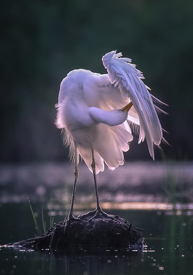 На краю тихого водоёма, на выступающем из воды камне, белая цапля устраивает утренний ритуал — расправляет перья, склоняя голову, словно в размышлении. Свет мягко озаряет её оперение, создавая контраст с тёмной водой и размытым фоном. Фотограф Вячеслав Мищенко запечатлел мгновение, наполненное тишиной и внутренним напряжением — будто птица готовится к встрече с чем-то важным. Сцена передаёт гармонию природы и тонкую драматичность момента, когда всё останавливается перед началом.